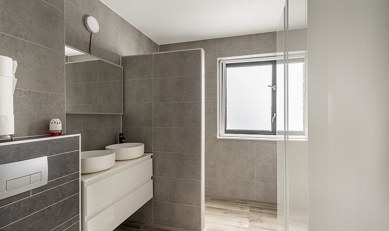 Landing. Storage cupboard. Modern spacious bathroom 3 m x 2.17 m equipped with a double washbasin unit, wall-mounted toilet and a walk-in shower. Bedroom at the front of approximately 10.4 m². Bedroom at the rear of approximately 12.9 m².