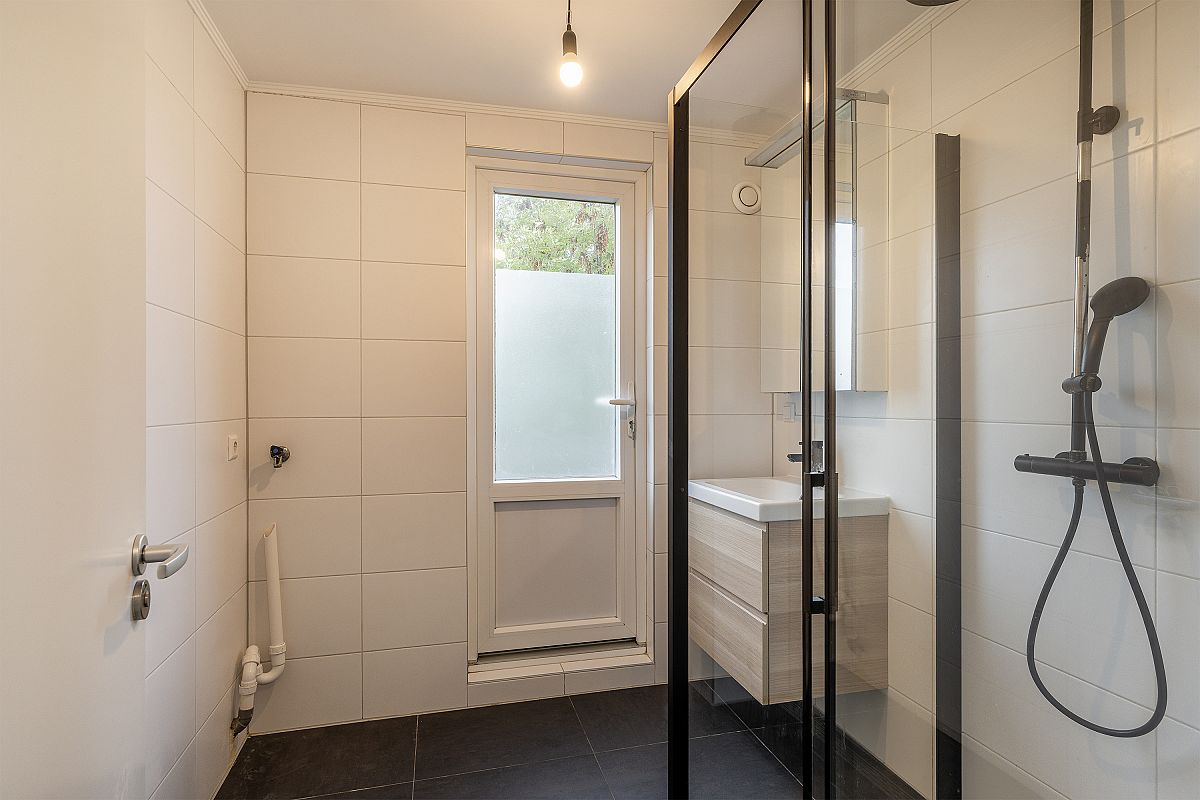 Overloop. Moderne badkamer voorzien van een wastafelmeubel, inloopdouche, designradiator, opstelling wasmachine en droger. Toegang naar het balkon.