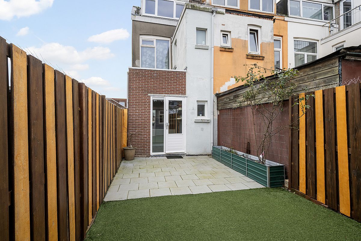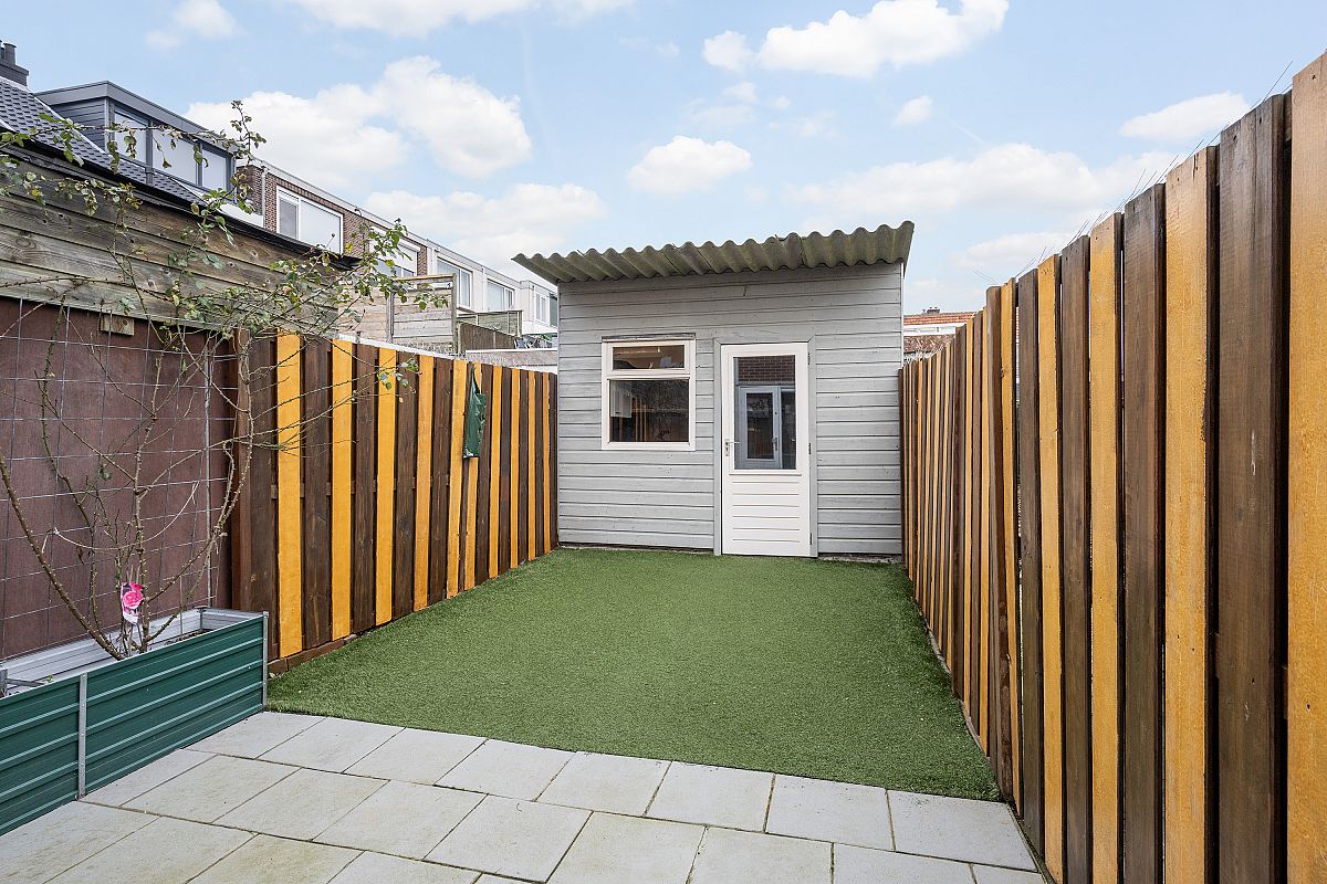 De woning heeft een mooie aangelegd tuin van ca. 9m x ca. 3,40m voorzien van mooie tuintegels, houten schuttingen, gazon en een houten berging met elektra.