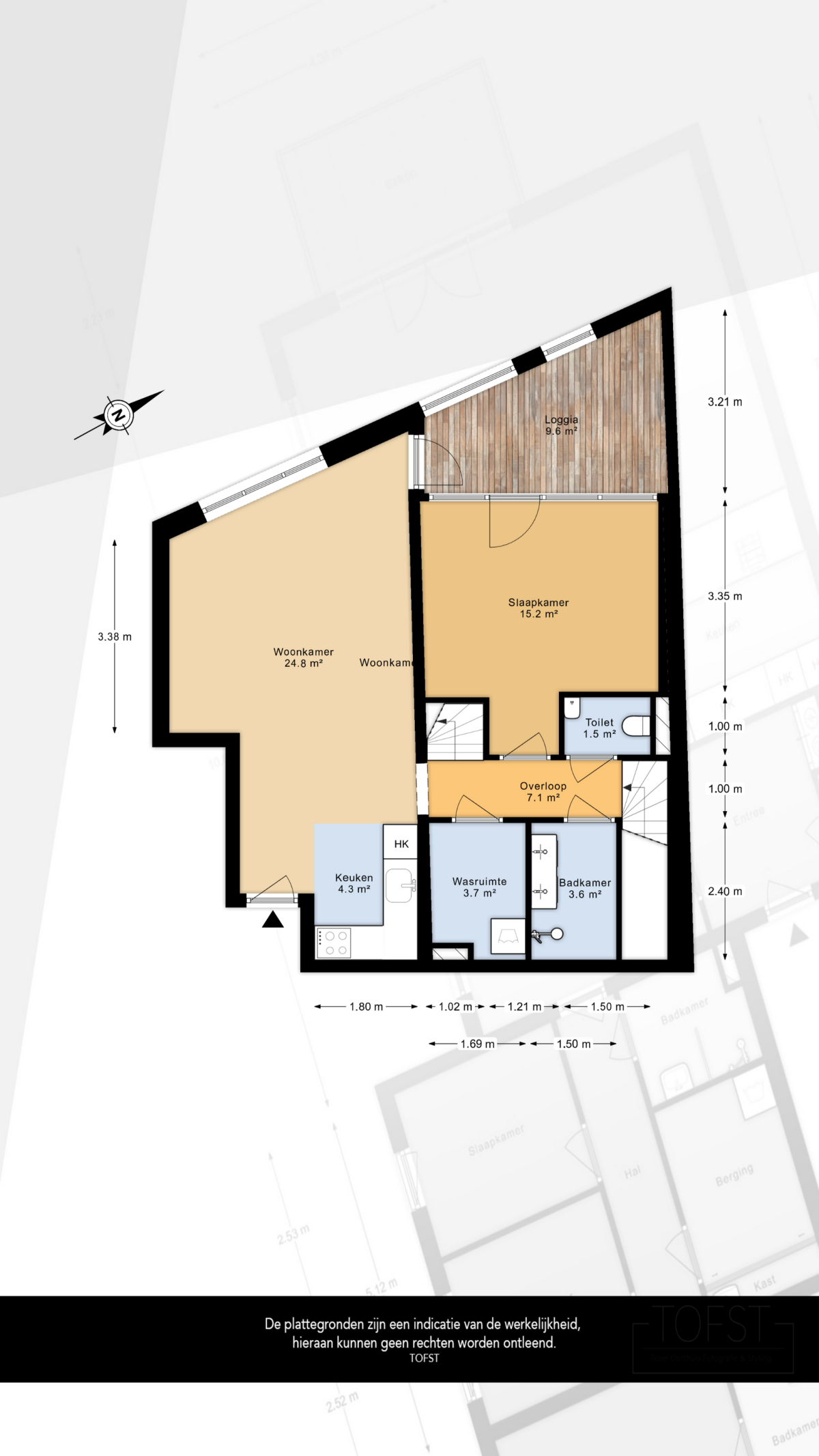 Ca. 95m2 woonoppervlak, + zolderruimte met 2 dakramen (max hoogte 2,4m) en ca. 9m2 buitenruimte.