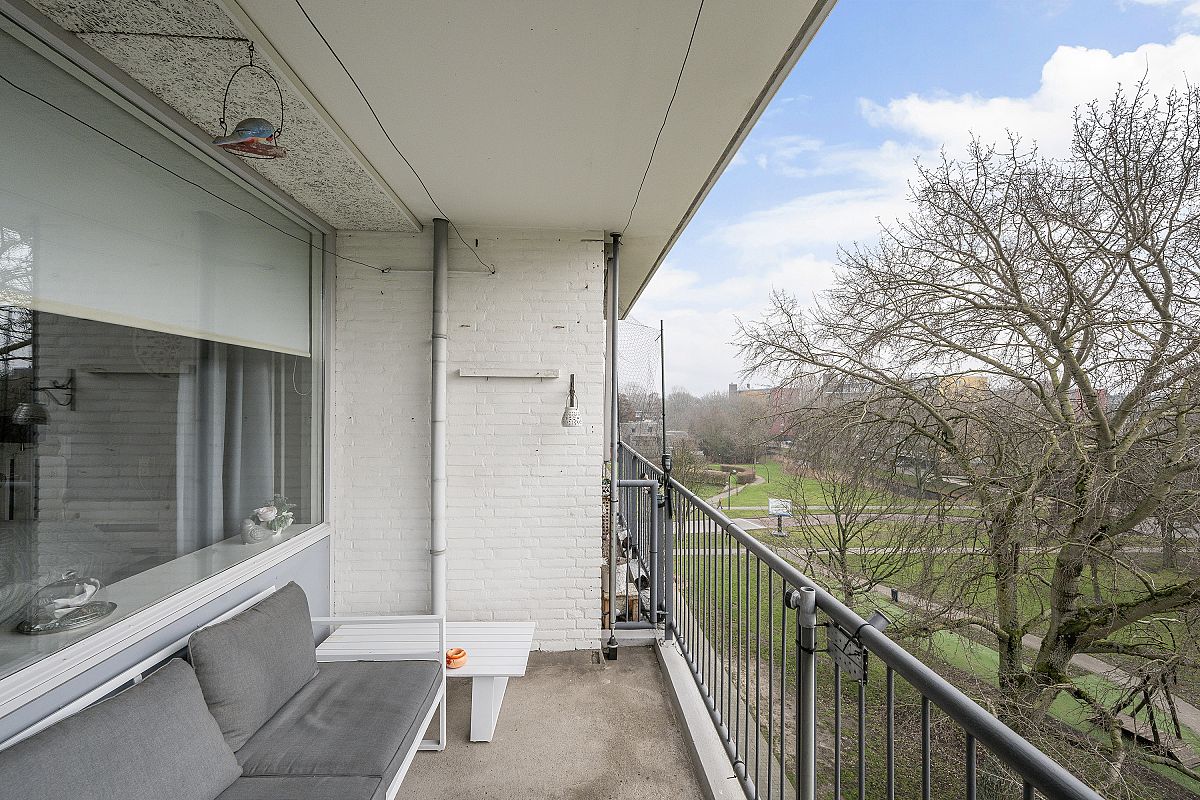 Groot zonnig balkon van ca. 7,3m2 (3,78 m x 2,02 m) op het zuiden, goed in te richten met terrasmeubilair of ligbedden. Vanaf het balkon is een mooi zicht over de wijk en het park.