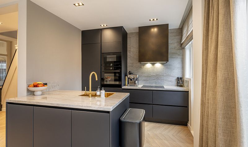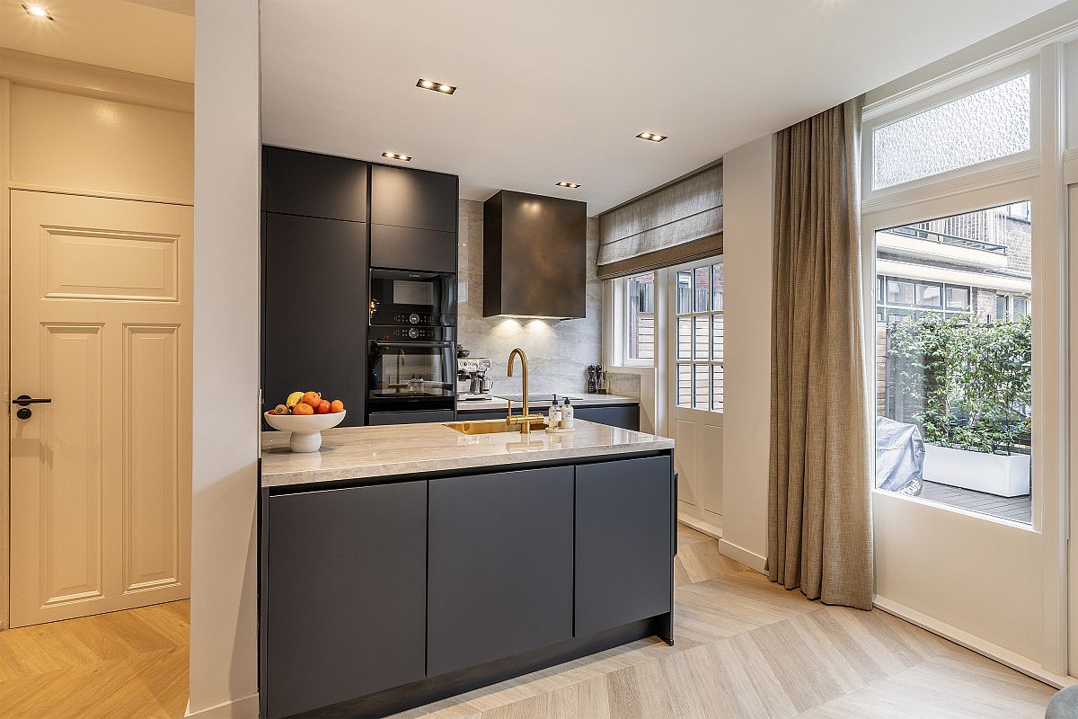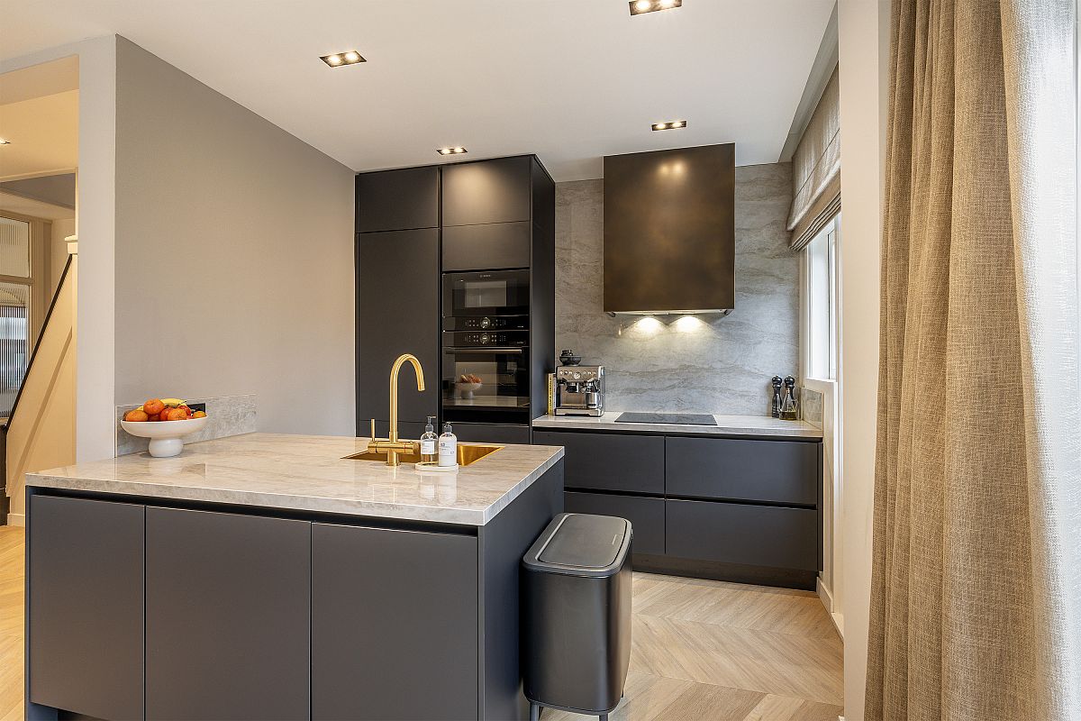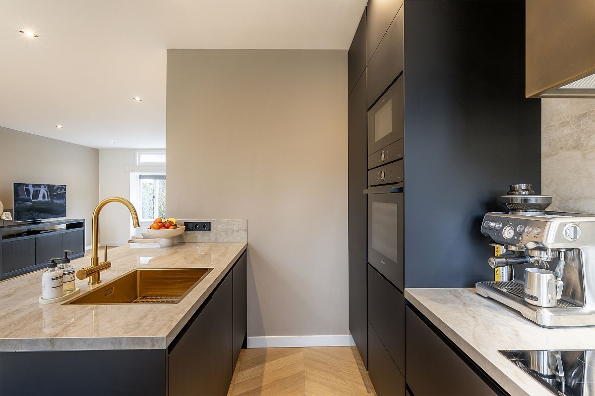 The luxury kitchen offers ample storage space and is equipped with a fridge/freezer drawers, dishwasher, oven, microwave, extractor hood, induction hob and a boiling water tap.