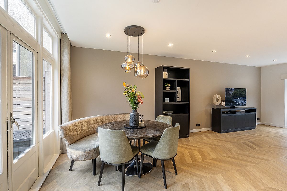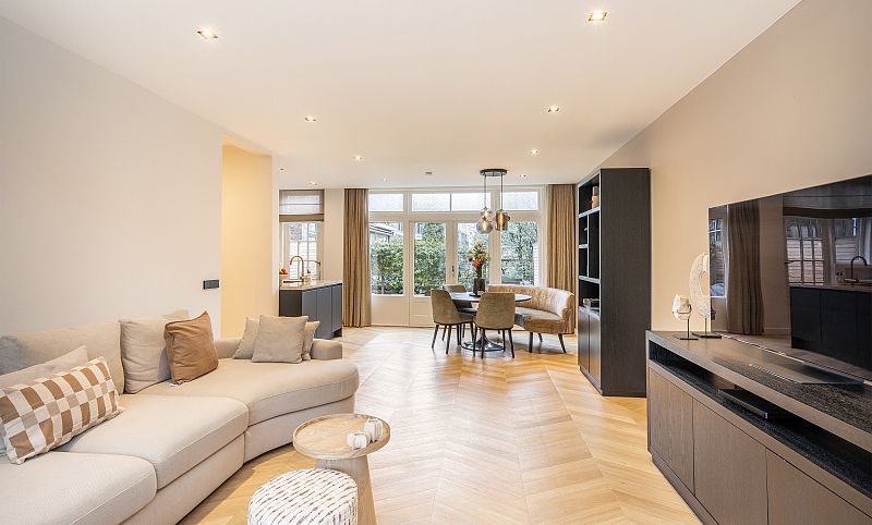 Entrance, vestibule with granito flooring. Hallway with under-stairs cupboard, storage space and meter cupboard. Toilet with washbasin. Spacious and attractive L-shaped living room of approximately 42 m², featuring underfloor heating, a characteristic bay window and a semi-open kitchen with cooking island. French doors and a separate kitchen door provide access to the garden.