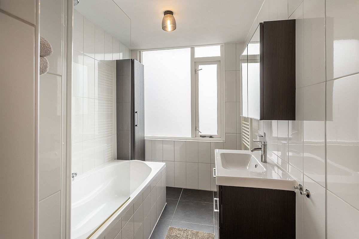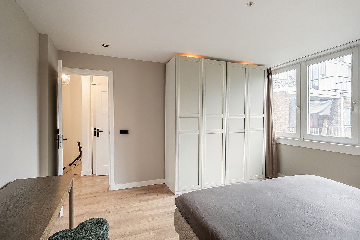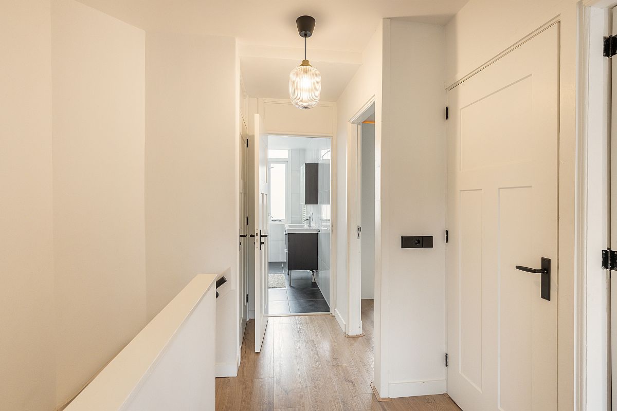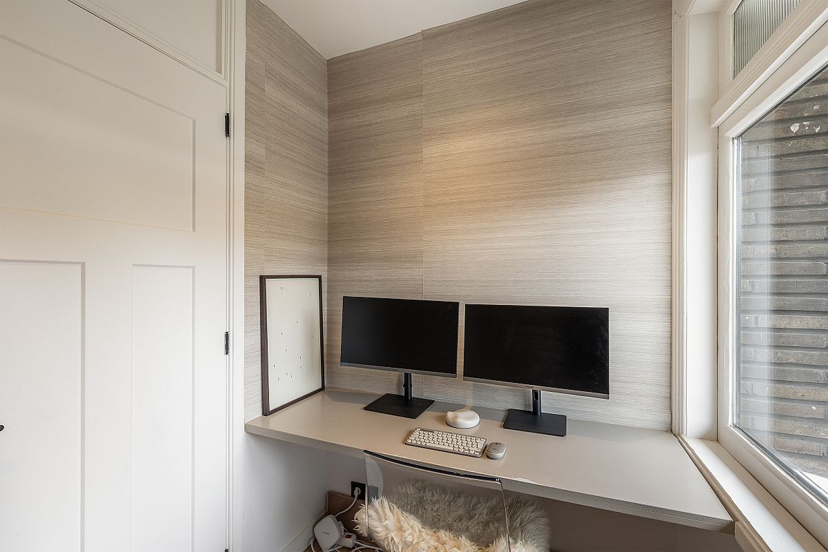 Overloop. Ruime hoofdslaapkamer aan de voorzijde van ca. 12m2 met inbouwkast onder de trap. Slaapkamer van ca. 18m2 aan de achterzijde met een inbouwkast. Praktische werkkamer van ca. 4m2 met op maat gemaakt bureau en inbouwopberging — ideaal voor thuiswerkers en toegang naar het balkon. Moderne badkamer voorzien van ligbad/douche combinatie, toilet, wastafelmeubel, hangend meubel en een designradiator.