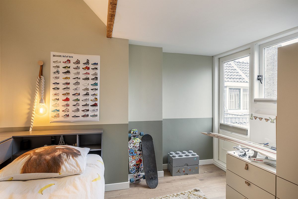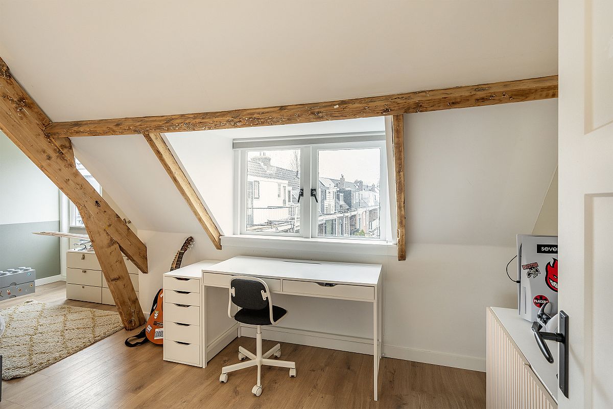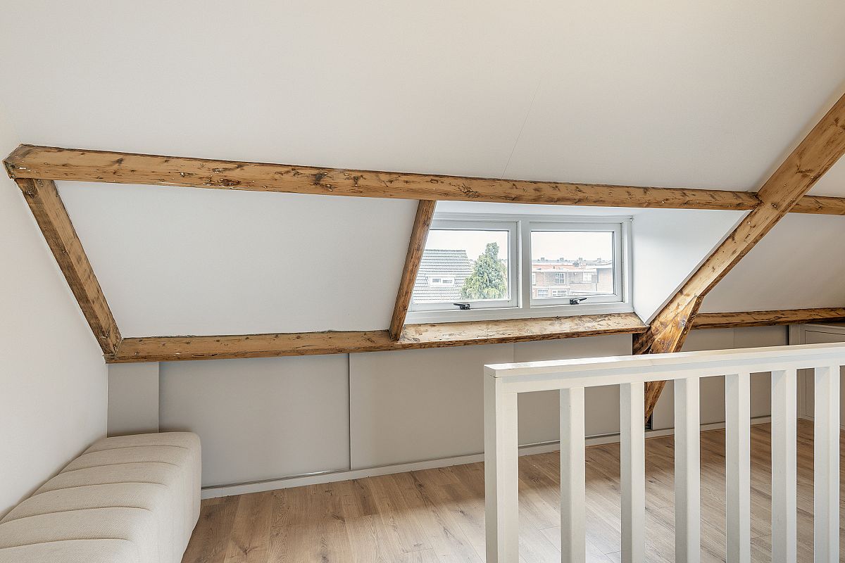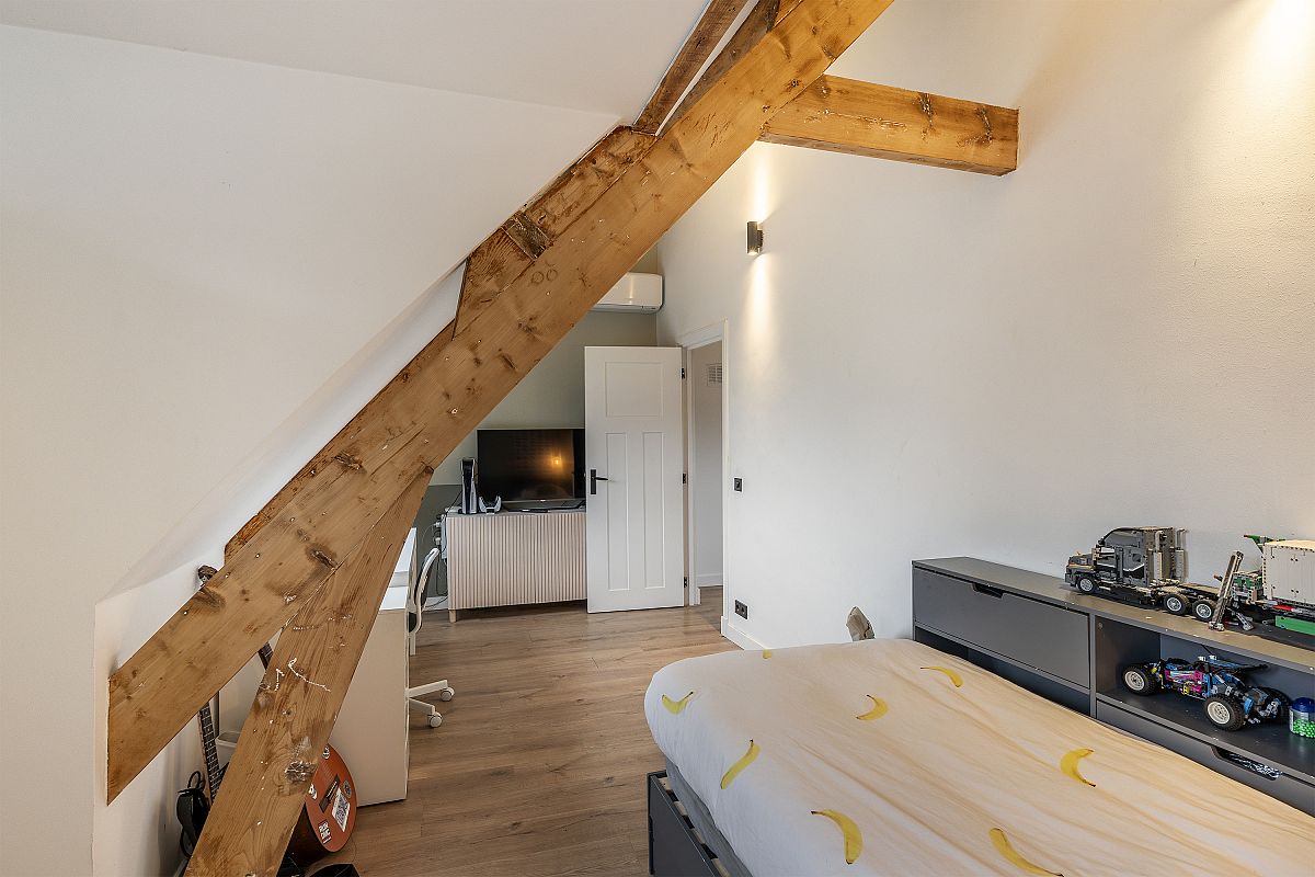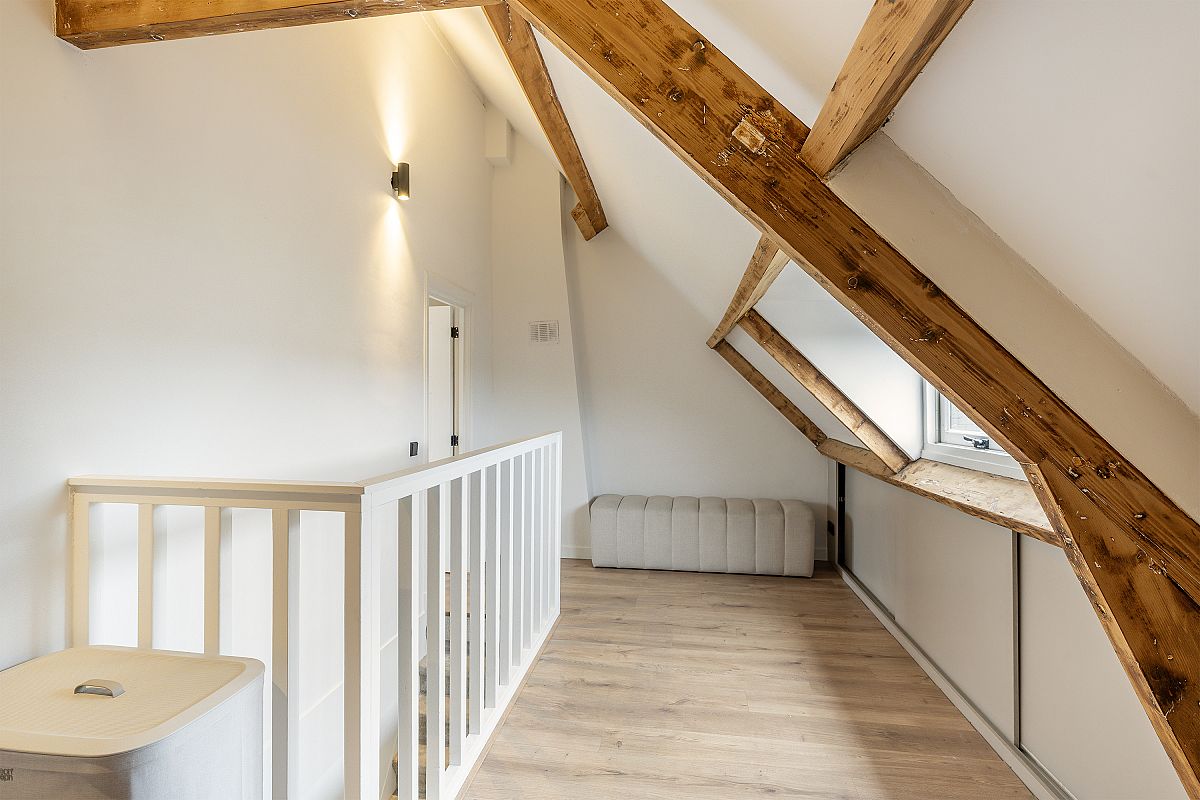 Accessible via a fixed staircase. Attractive attic floor with authentic wooden beams. Spacious landing/bedroom of approximately 14.9 m² with dormer window. A custom-made cabinet houses the central heating boiler and connections for washing machine and dryer. Additional storage space is available behind the knee walls.