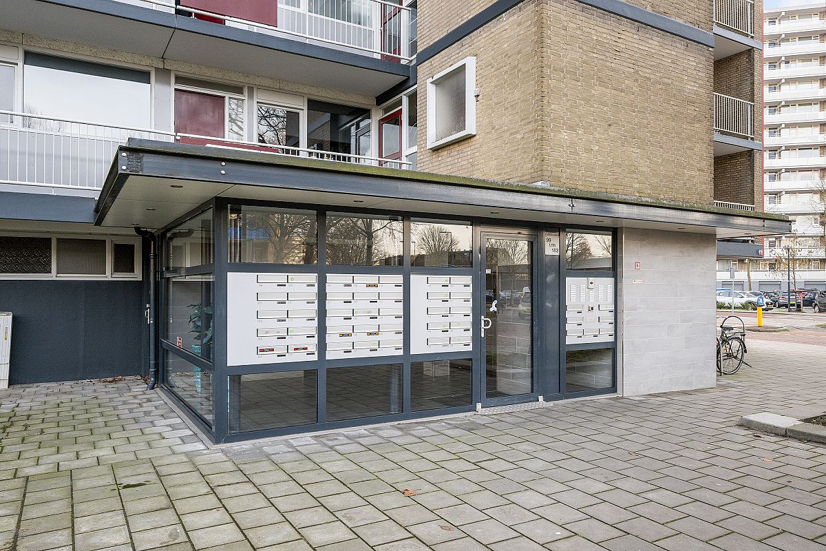 Afgesloten entree, brievenbussen en bellentableau, entree tot bergingen, liften, trappenhuis.