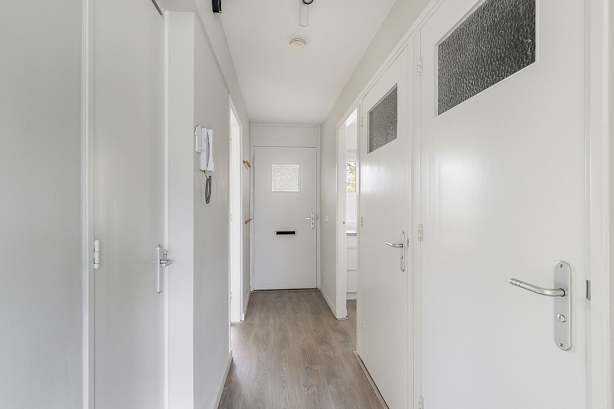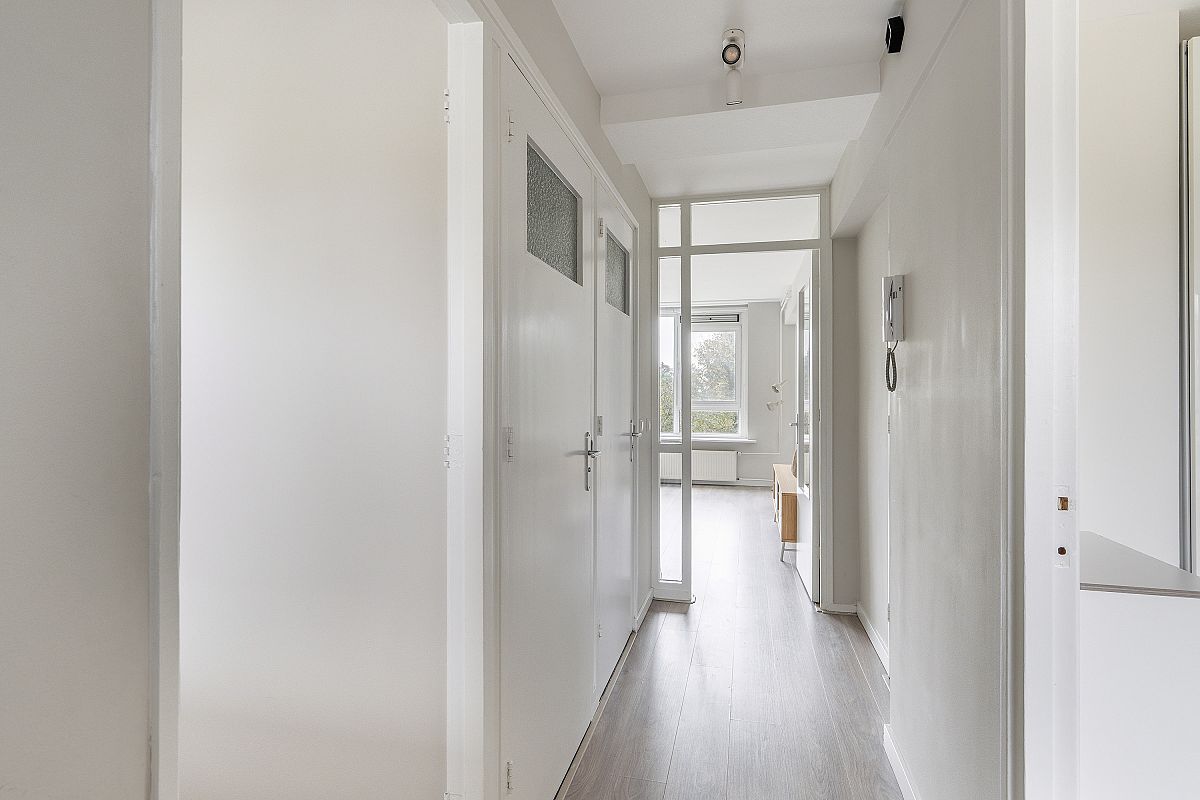 Entree, gang, meterkast. Toilet. Dichte hoekkeuken voorzien van gaskookplaat, afzuigkap, vaatwasser, koelkast en vriesladen, inbouwkast met opstelling van de boiler. Slaapkamer aan de voorzijde van ca. 11,2m2 met ingebouwde kledingkast. Vergrote badkamer voorzien van een inloopdouche, wastafelmeubel en ruimte voor de wasmachine. Sfeervolle woonkamer van ca. 17,2m2 met een leuk zicht naar het groen. Achterslaapkamer van ca. 11,7m2. Toegang tot het balkon.