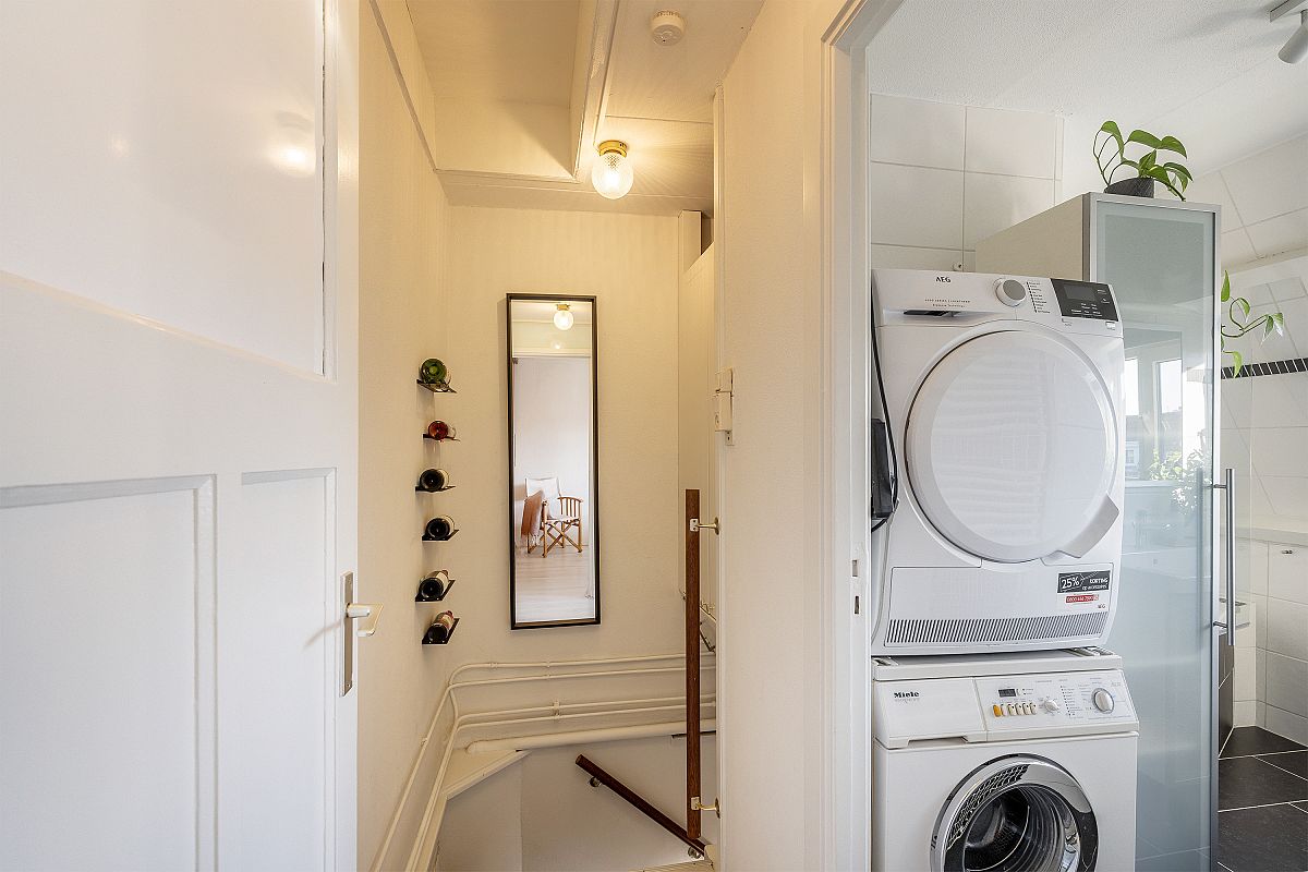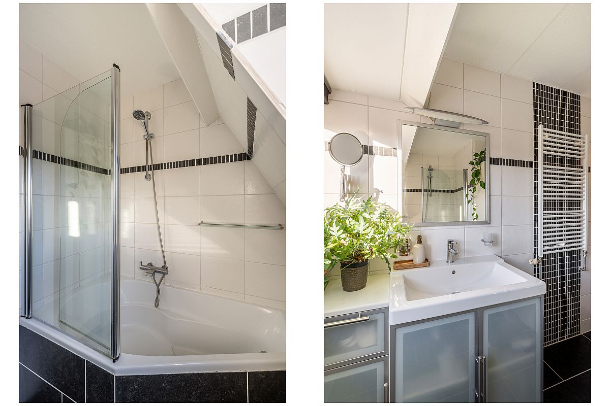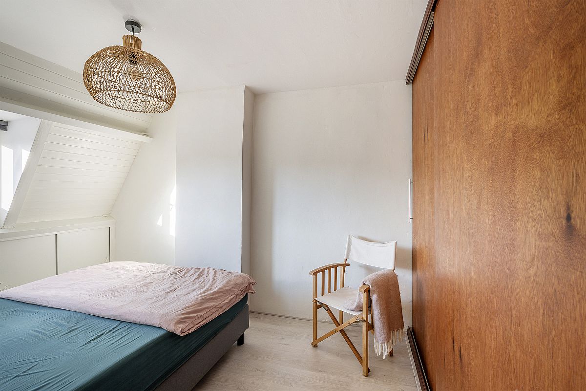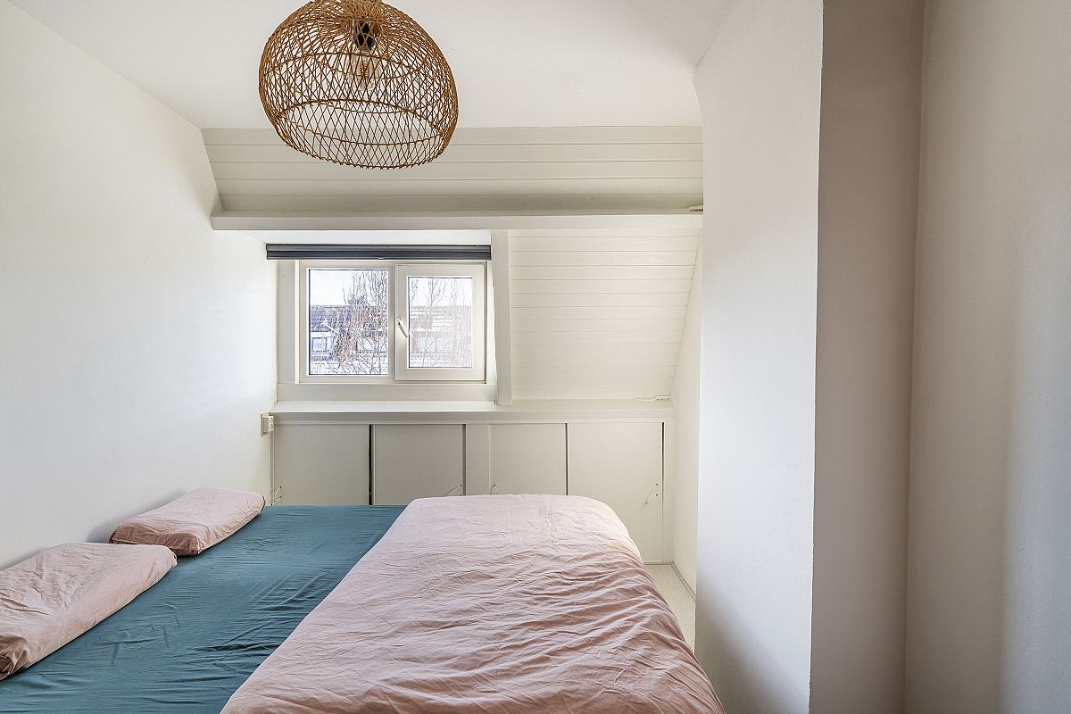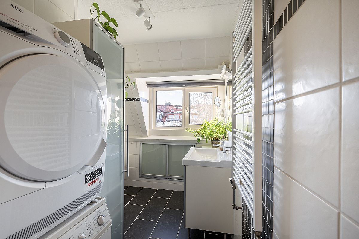 Overloop met toegang tot de tweede slaapkamer en de badkamer. De CV ketel is geplaatst in het trapgat. De slaapkamer op deze verdieping is ca. 11m2 groot en is voorzien van een vaste kast en extra bergruimte achter de knieschotten. De modern uitgevoerde badkamer geheel betegeld en voorzien van een ligbad, een wastafelmeubel en een designradiator. Daarnaast bevinden de wasmachine en droger zich hier. De 2e verdieping heeft een kunststof dakkapel aan de straatzijde.