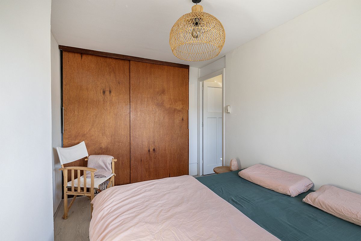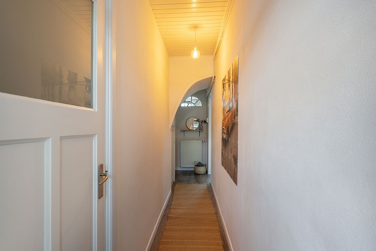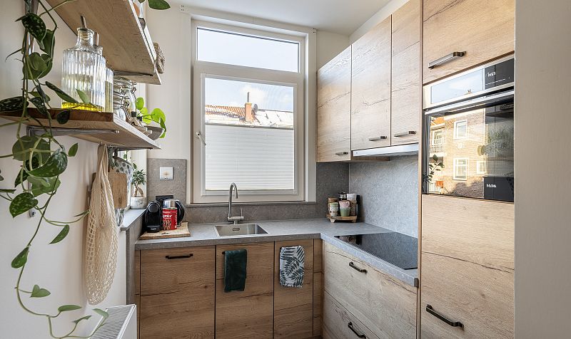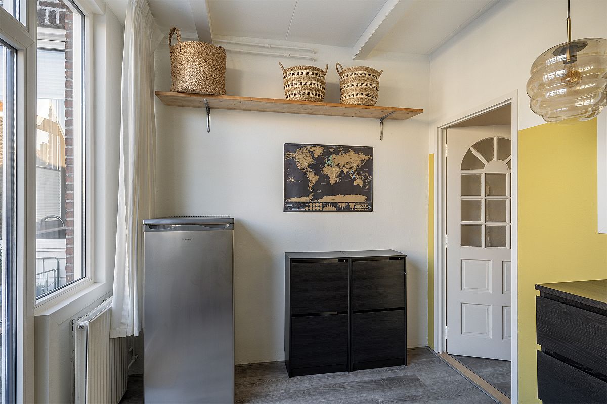 Ruime overloop met toilet, bergkast en toegang tot de keuken den de woonkamer. Aan de achterzijde ligt de slaapkamer van ruim 8m2. Deze kamer geeft toegang tot het balkon. De riante woonkamer van bijna 29m2 ligt aan de voorzijde, heeft een sfeervolle erker en schouw en heeft een opentrap naar de 2e verdieping. De keuken is in 2024 vernieuwd en voorzien van een fraai keukenblok in een hoekopstelling. De navolgende inbouwapparatuur maken de keuken compleet: inductiekookplaat, afzuigkap, vaatwasser, koelkast en combimagnetron.
