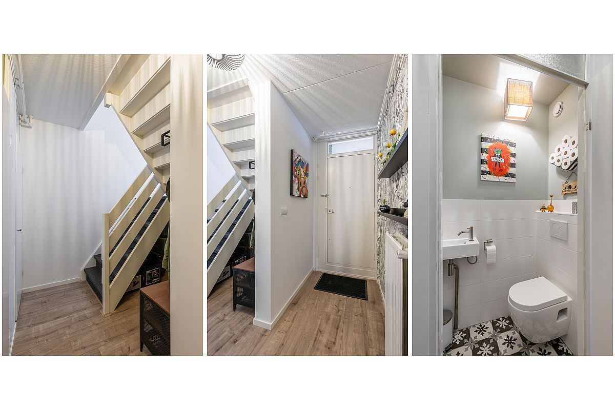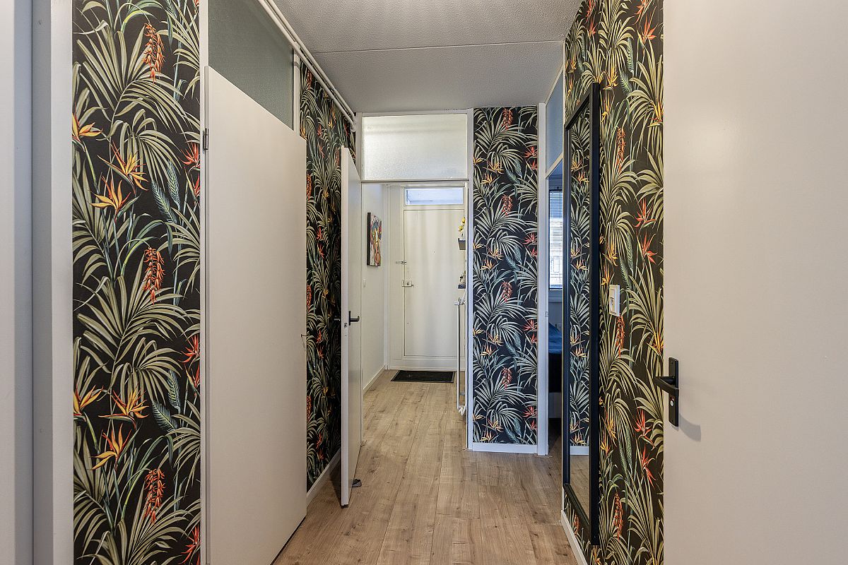 Toegang via centrale hal met brievenbussen en trappenhuis naar de woning.