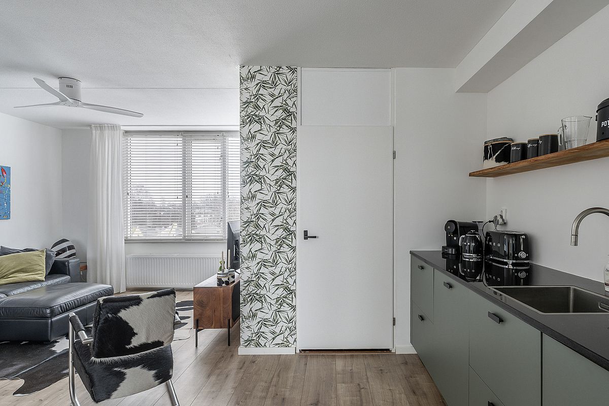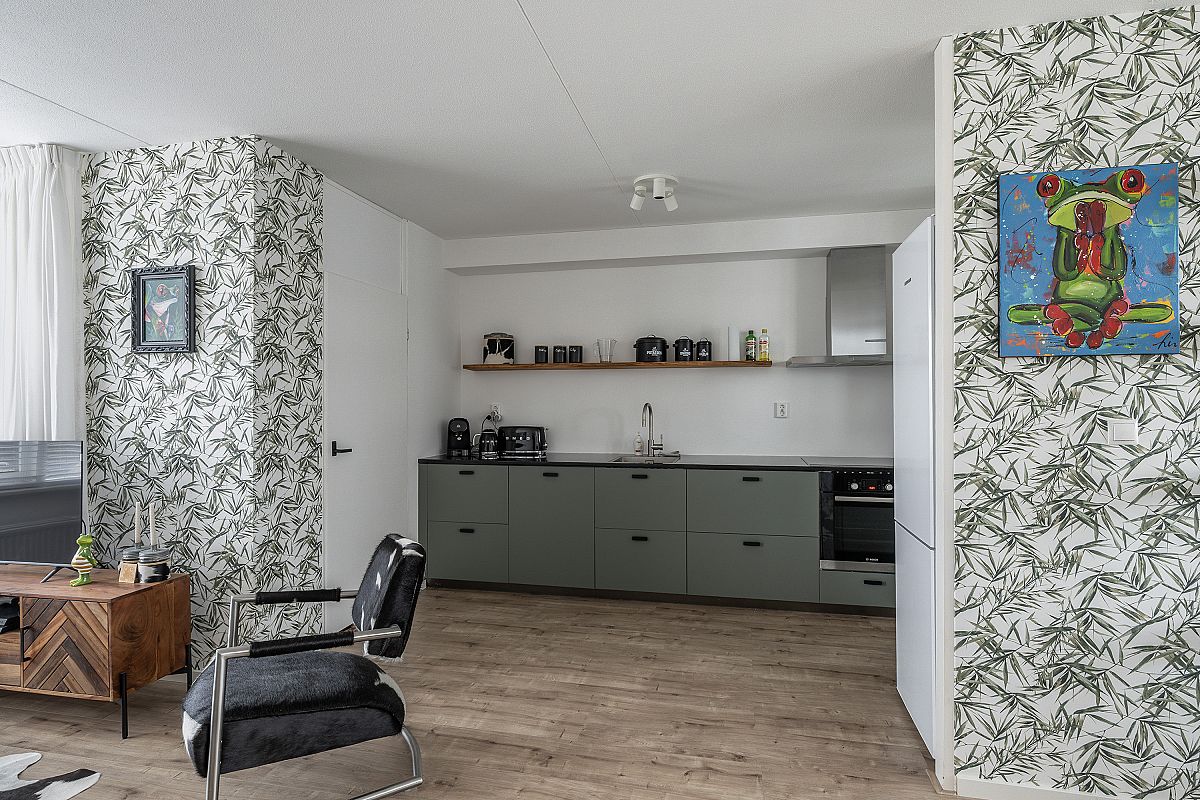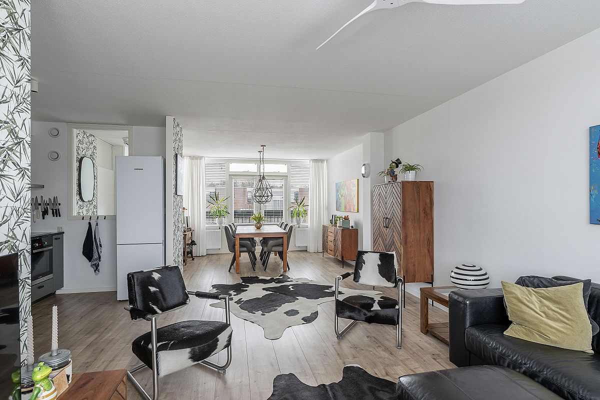 Derde verdieping, overloop, cv kast. Royale sfeervolle woonkamer van ca. 42,2m2 met een openkeuken en met een directe toegang naar het zonnige terras via openslaande deuren. De woonkamer ademt een prettige sfeer, heeft een mooie lichtinval en een leuke doorkijk over de wijk. De keuken is voorzien van een inductie kookplaat (2024), een afzuigkap, een oven, een vaatwasser (allen van het merk Bosch) en een koelkast/vriescombinatie (Liebherr). Naast de keuken bevindt zich een praktische inpandige bergruimte. Ook deze etage is voorzien van laminaat met hoge witte plinten en gestucte wanden.