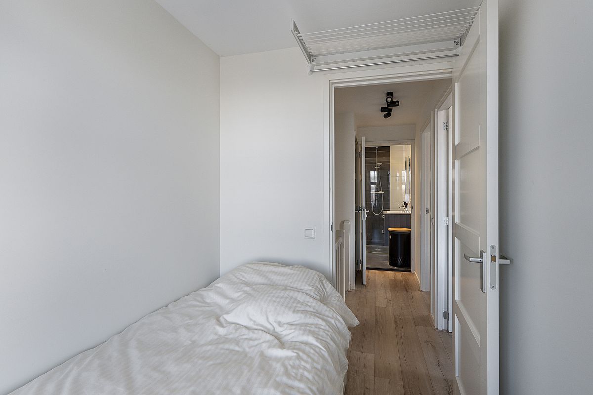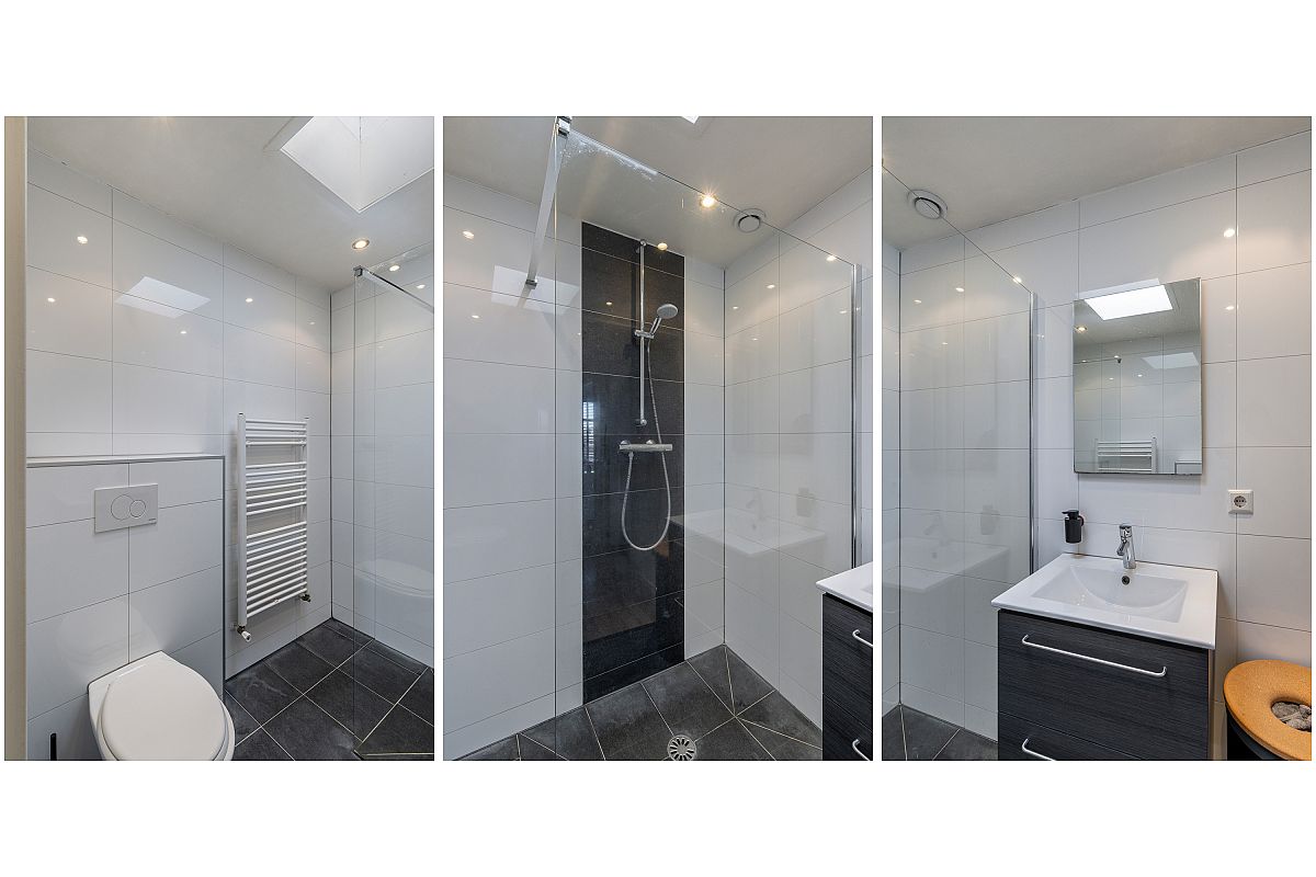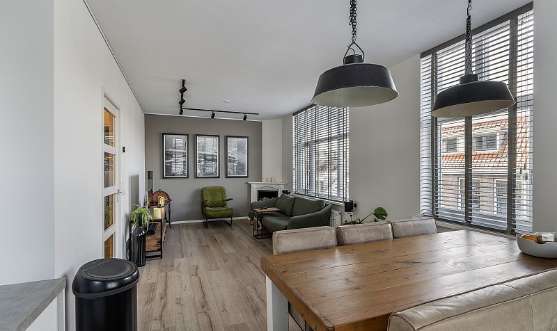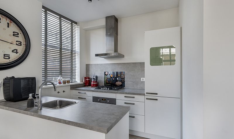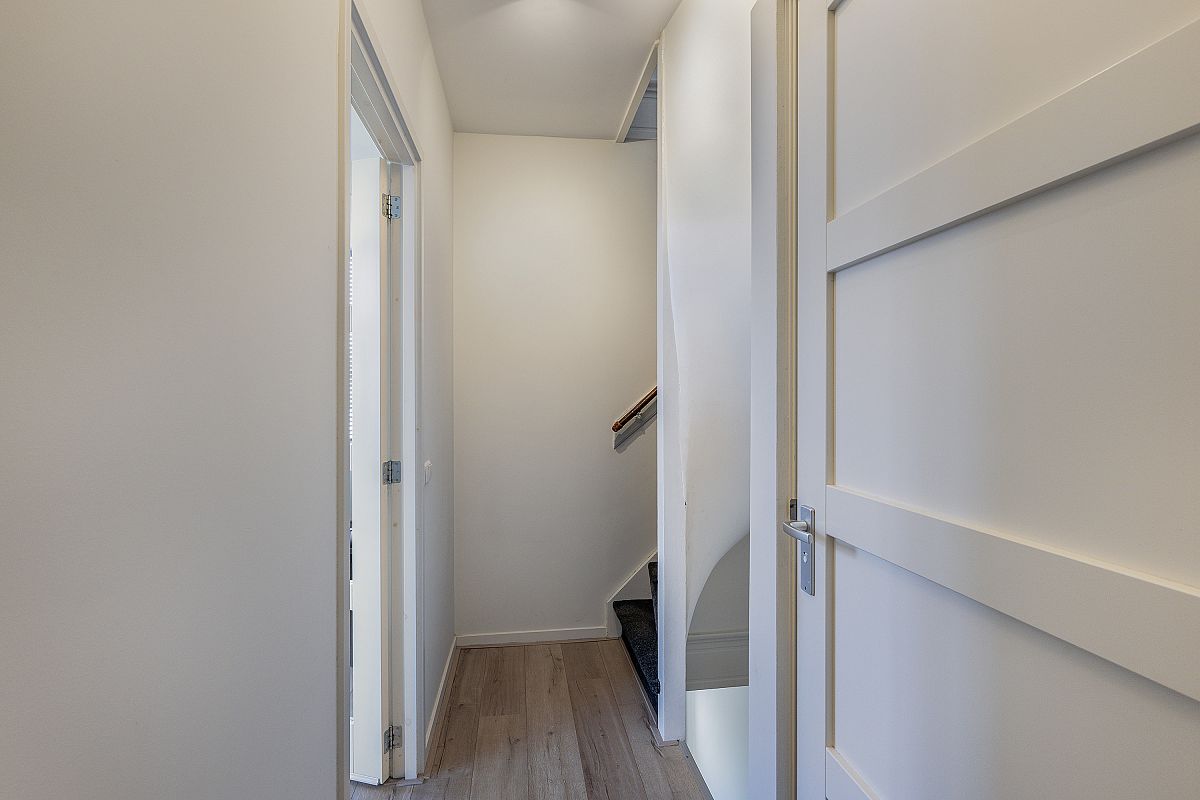 Overloop, aparte toilet ruimte, modern uitgevoerd met hangend toilet en fonteintje. Op deze verdieping bevindt zich nog een aparte kamer van ca. 3m2, ideaal te gebruiken als werkkamer of garderobe. De woonkamer en open keuken zijn tezamen meer dan 31m2. Door de hoekligging zijn er veel ramen aanwezig, wat zorgt voor veel en een prettige lichtinval. De keuken is uitgevoerd met een spoeleiland, veel kastruimte en de volgende inbouwapparatuur: koelkast, vriezer, combimagnetron, gaskookplaat, afzuigkap en een vaatwasser.