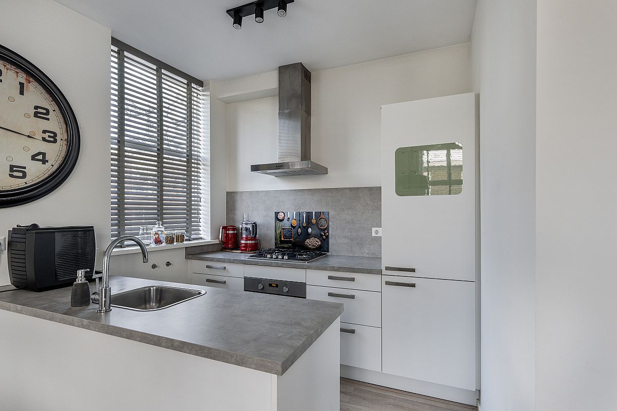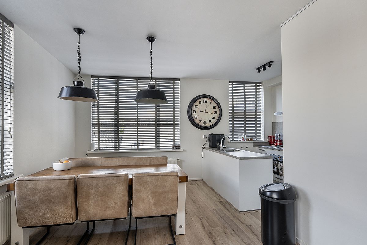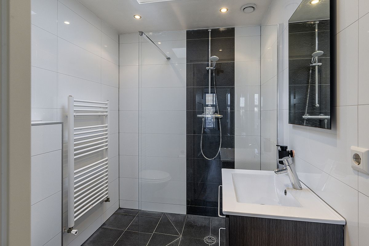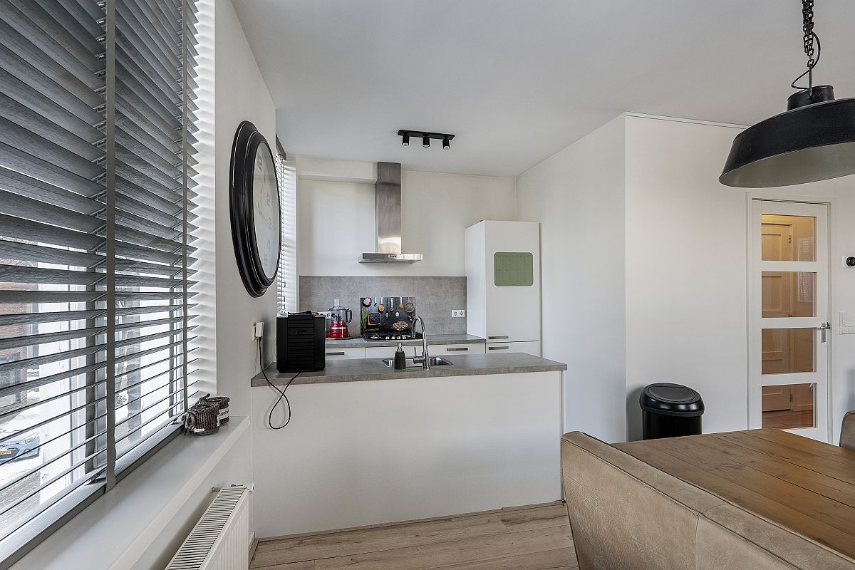 Overloop, aparte toilet ruimte, modern uitgevoerd met hangend toilet en fonteintje. Op deze verdieping bevindt zich nog een aparte kamer van ca. 3m2, ideaal te gebruiken als werkkamer of garderobe. De woonkamer en open keuken zijn tezamen meer dan 31m2. Door de hoekligging zijn er veel ramen aanwezig, wat zorgt voor veel en een prettige lichtinval. De keuken is uitgevoerd met een spoeleiland, veel kastruimte en de volgende inbouwapparatuur: koelkast, vriezer, combimagnetron, gaskookplaat, afzuigkap en een vaatwasser.