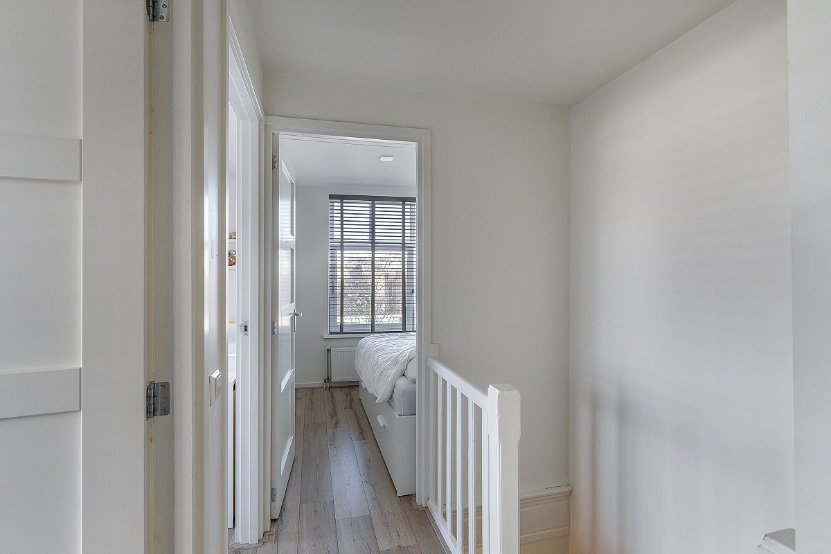Overloop, diepe bergkast met aansluiting voor de wasmachine. Slaap/werkkamer van ca. 4.5m2. Modern uitgevoerde badkamer met mechanische ventilatie en voorzien van neutraal modern tegelwerk, een lichtkoepel, radiator, 2e toilet, inloopdouche en een wastafelmeubel. De hoofdslaapkamer is ca. 14m2 en is voorzien van een vaste kastenwand. De andere grote slaapkamer op deze verdieping is ca. 13m2.