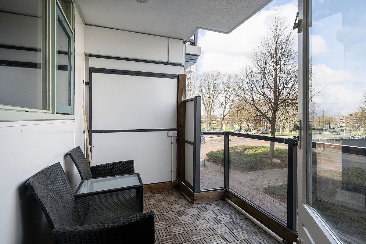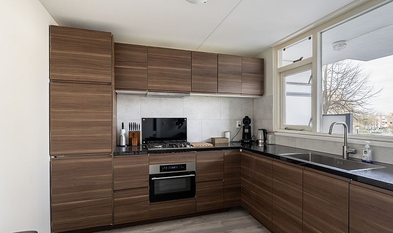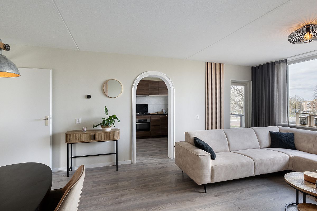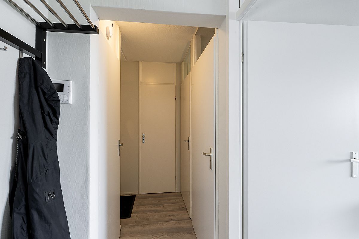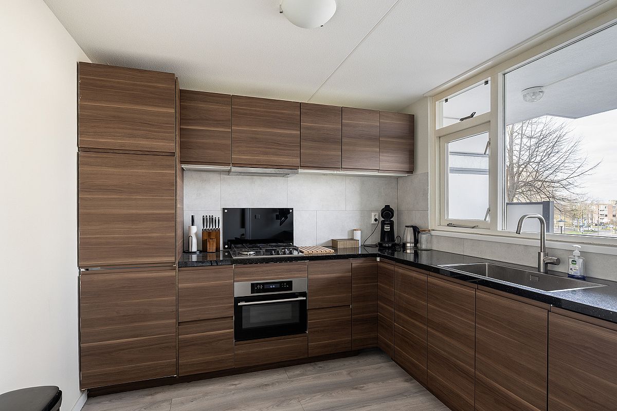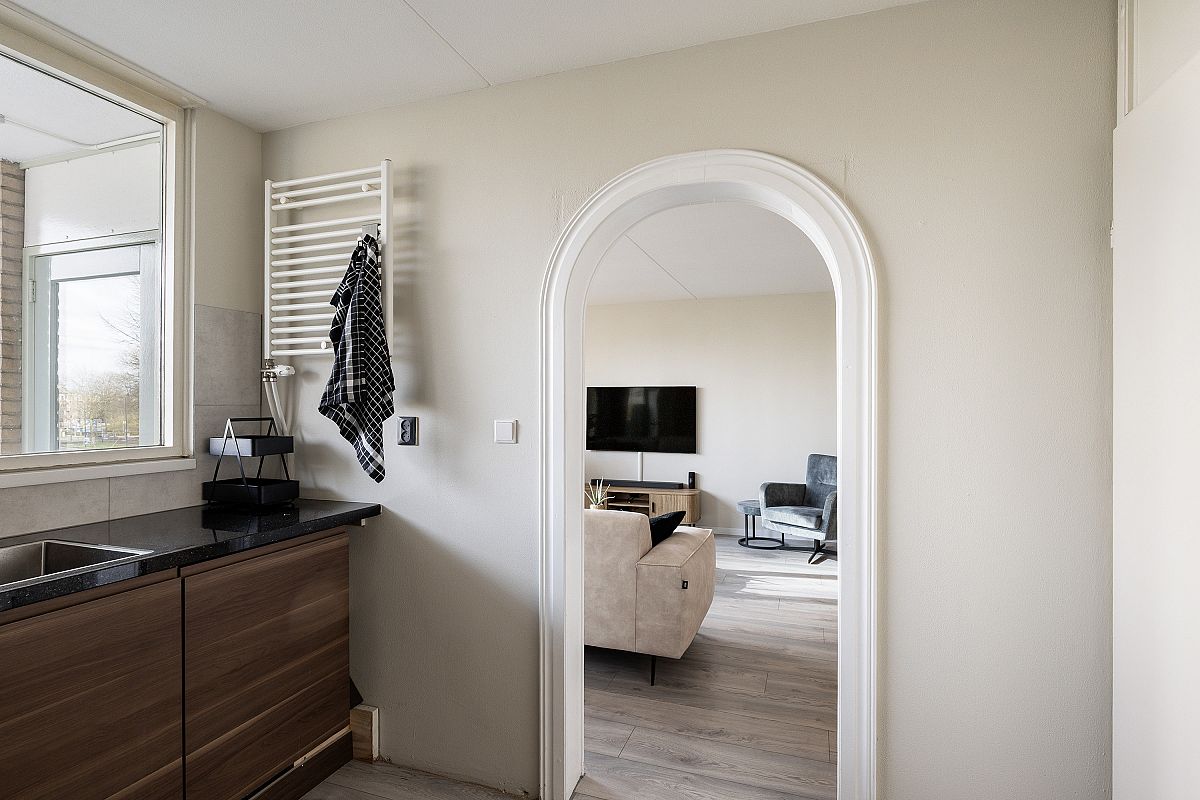 Entree, hal, meterkast en een praktische bergkast met de CV-ketel. De ruime en lichte woonkamer met aangrenzende keuken van tezamen circa 35m² is voorzien van een laminaatvloer en een directe toegang tot het balkon. De modern uitgevoerde keuken is uitgerust met veel werkblad en de navolgende inbouwapparatuur zoals een gaskookplaat, afzuigkap, combi-oven, koel-/vriescombinatie en vaatwasser. Riante slaapkamer van circa 13 m² voorzien van een ingebouwde kastenwand. De volledig betegelde badkamer heeft een douchecabine, wastafelmeubel en een aansluiting voor de wasmachine en droger. Toilet zit apart.