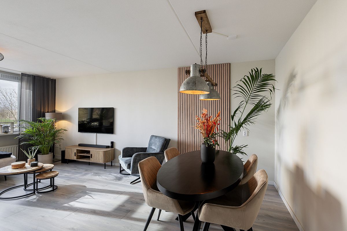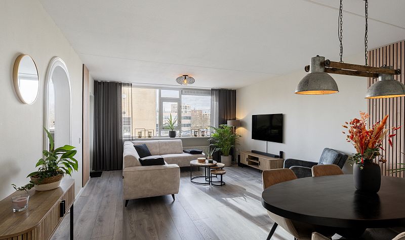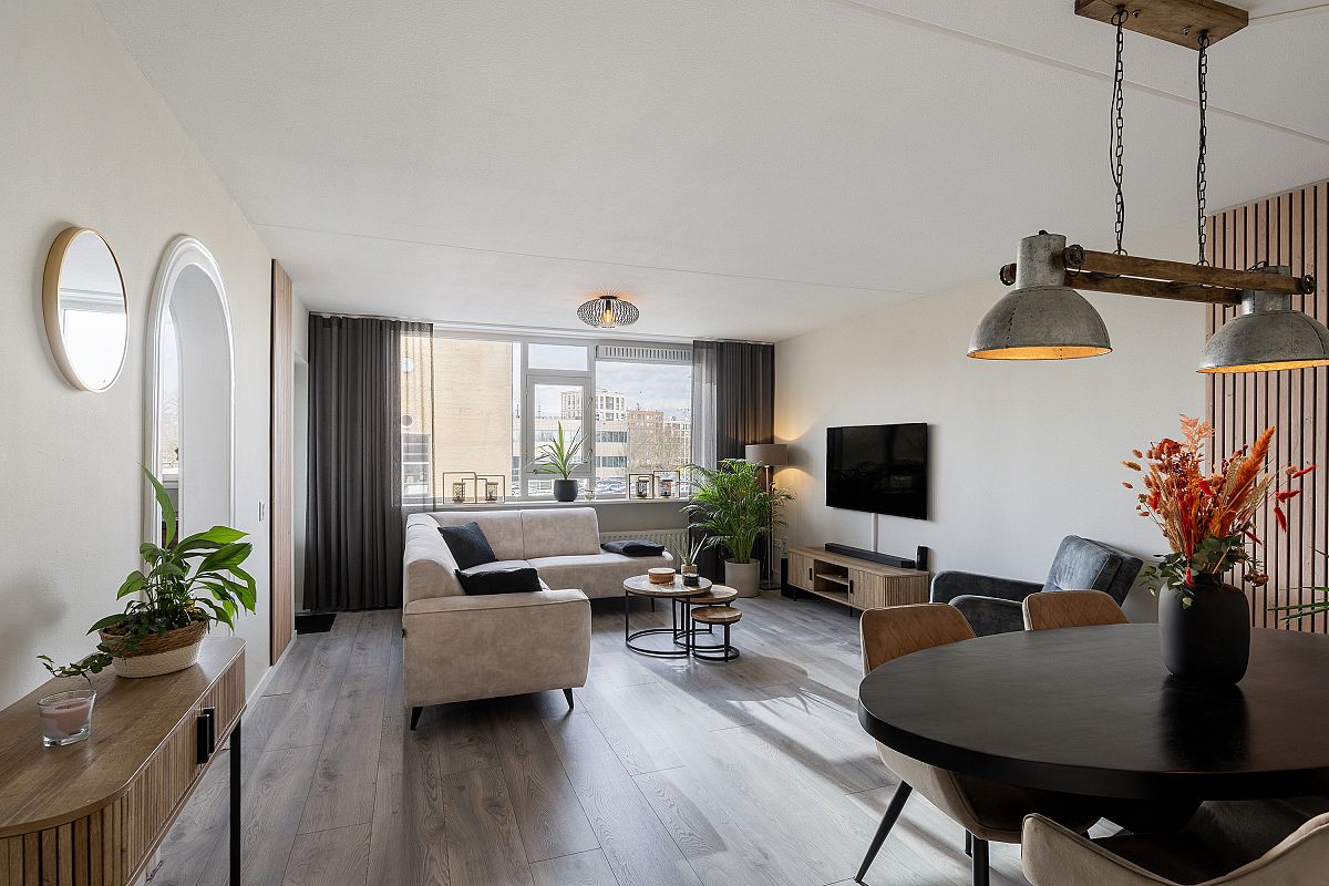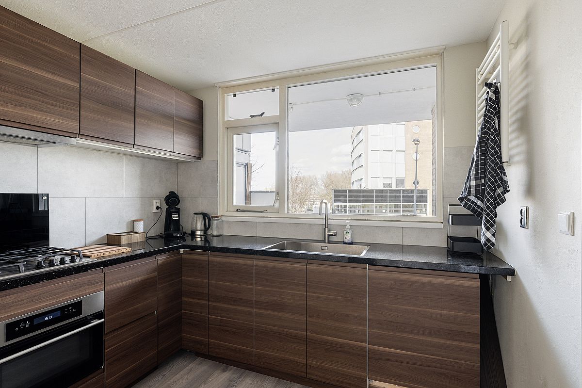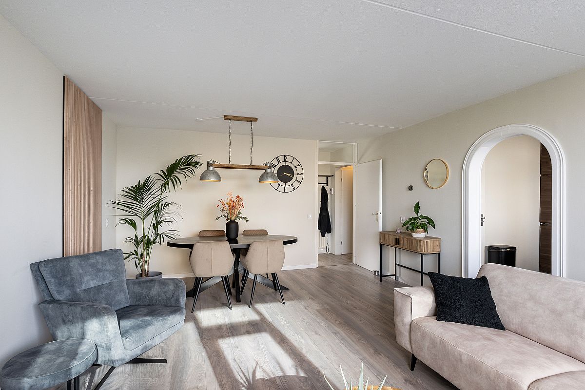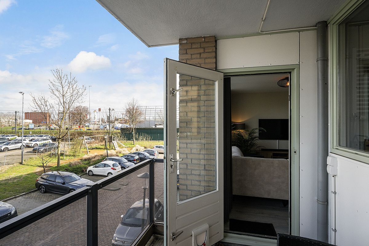 Entree, hal, meterkast en een praktische bergkast met de CV-ketel. De ruime en lichte woonkamer met aangrenzende keuken van tezamen circa 35m² is voorzien van een laminaatvloer en een directe toegang tot het balkon. De modern uitgevoerde keuken is uitgerust met veel werkblad en de navolgende inbouwapparatuur zoals een gaskookplaat, afzuigkap, combi-oven, koel-/vriescombinatie en vaatwasser. Riante slaapkamer van circa 13 m² voorzien van een ingebouwde kastenwand. De volledig betegelde badkamer heeft een douchecabine, wastafelmeubel en een aansluiting voor de wasmachine en droger. Toilet zit apart.
