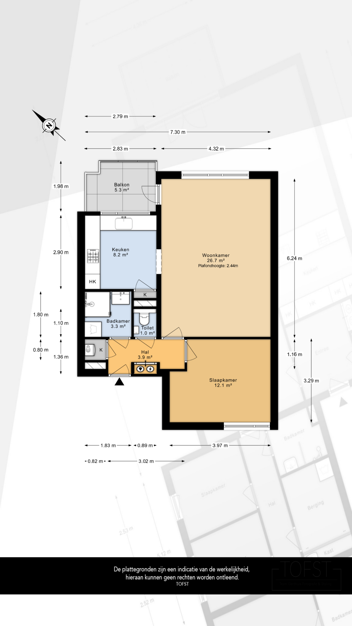 De Meetinstructie is gebaseerd op de NEN2580. De Meetinstructie is bedoeld om een meer eenduidige manier van meten toe te passen voor het geven van een indicatie van de gebruiksoppervlakte. De Meetinstructie sluit verschillen in meetuitkomsten niet volledig uit, door bijvoorbeeld interpretatieverschillen, afrondingen of beperkingen bij het uitvoeren van de meting. Indien de exacte maten voor een koper van cruciaal belang zijn, adviseren wij deze zelf na te meten.