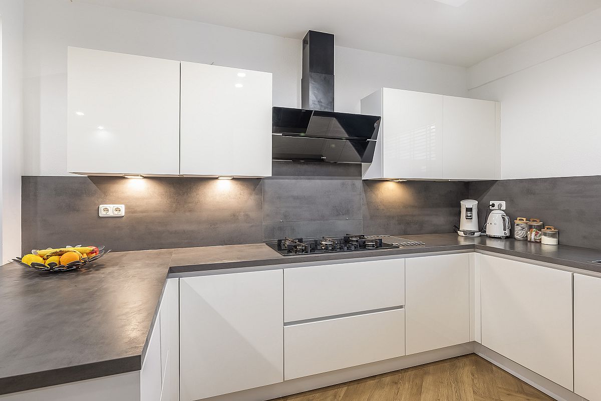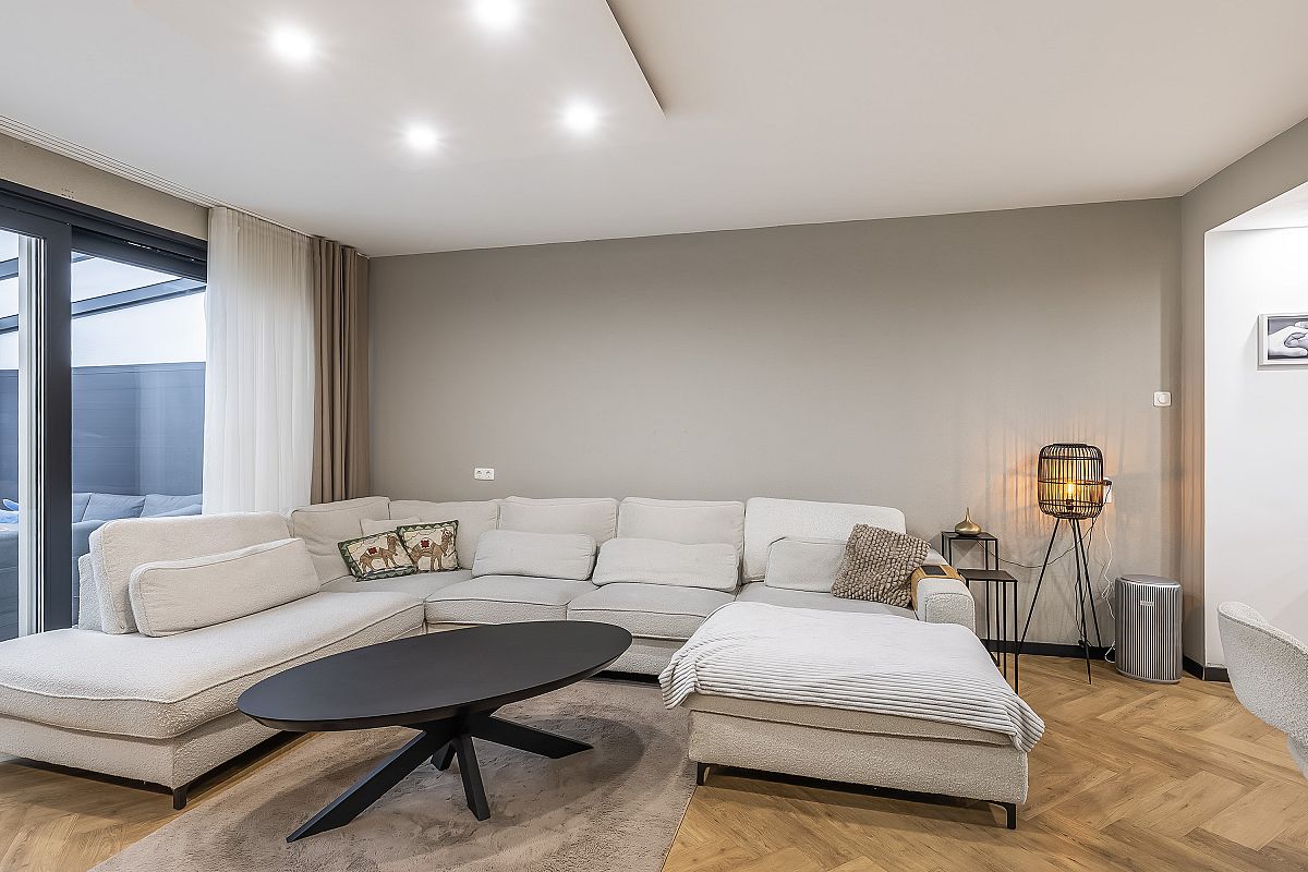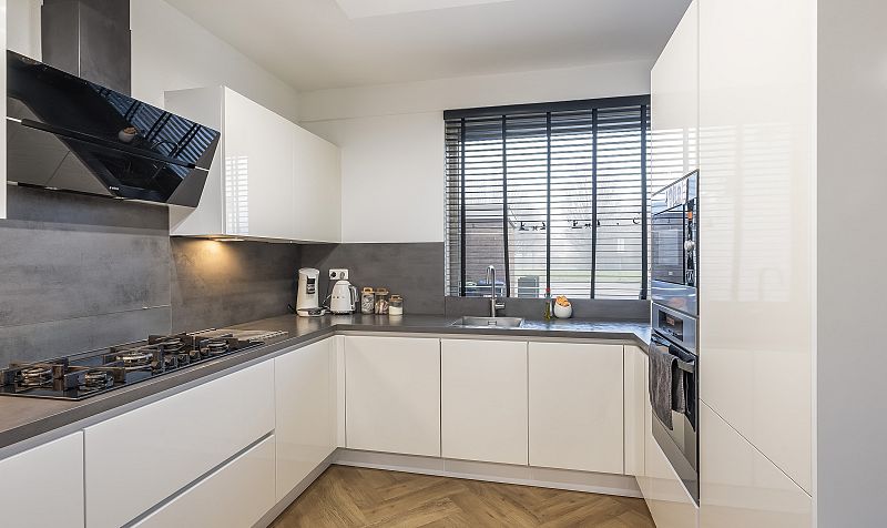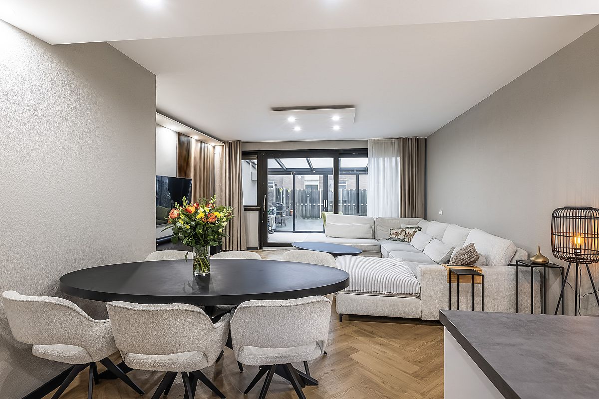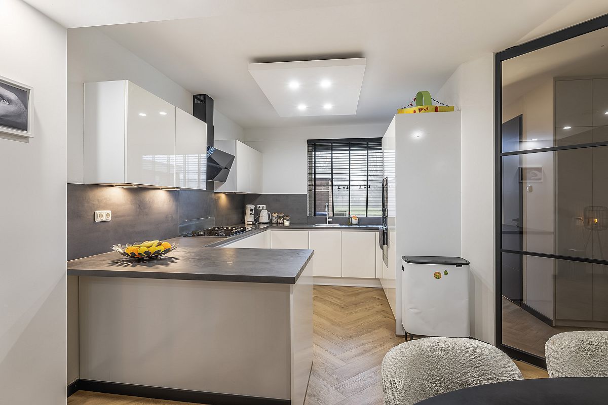 Entree, hal, meterkast, modern toilet met fonteintje, trapopgang naar de slaapverdieping, via een stalen deur toegang tot de woonkamer/keuken. De keuken bevindt zich aan de voorzijde en is voorzien van een ruime hoekopstelling met hoogglans wit front en de navolgende inbouwapparatuur: aparte oven en aparte magnetron, koelkast/vriezer, 5 pits gaskookplaat, afzuigkap en een vaatwasser. Er zijn verder meer dan voldoende boven-en onderkasten en lades. De woonkamer met open keuken van tezamen meer dan 40m2 is strak afgewerkt met gestuukte wanden en plafonds en een fraaie vloer met vloerverwarming. Via een schuifpui wordt de extra zitkamer/serre bereikt. Via deze kamer is de tuin bereikbaar.