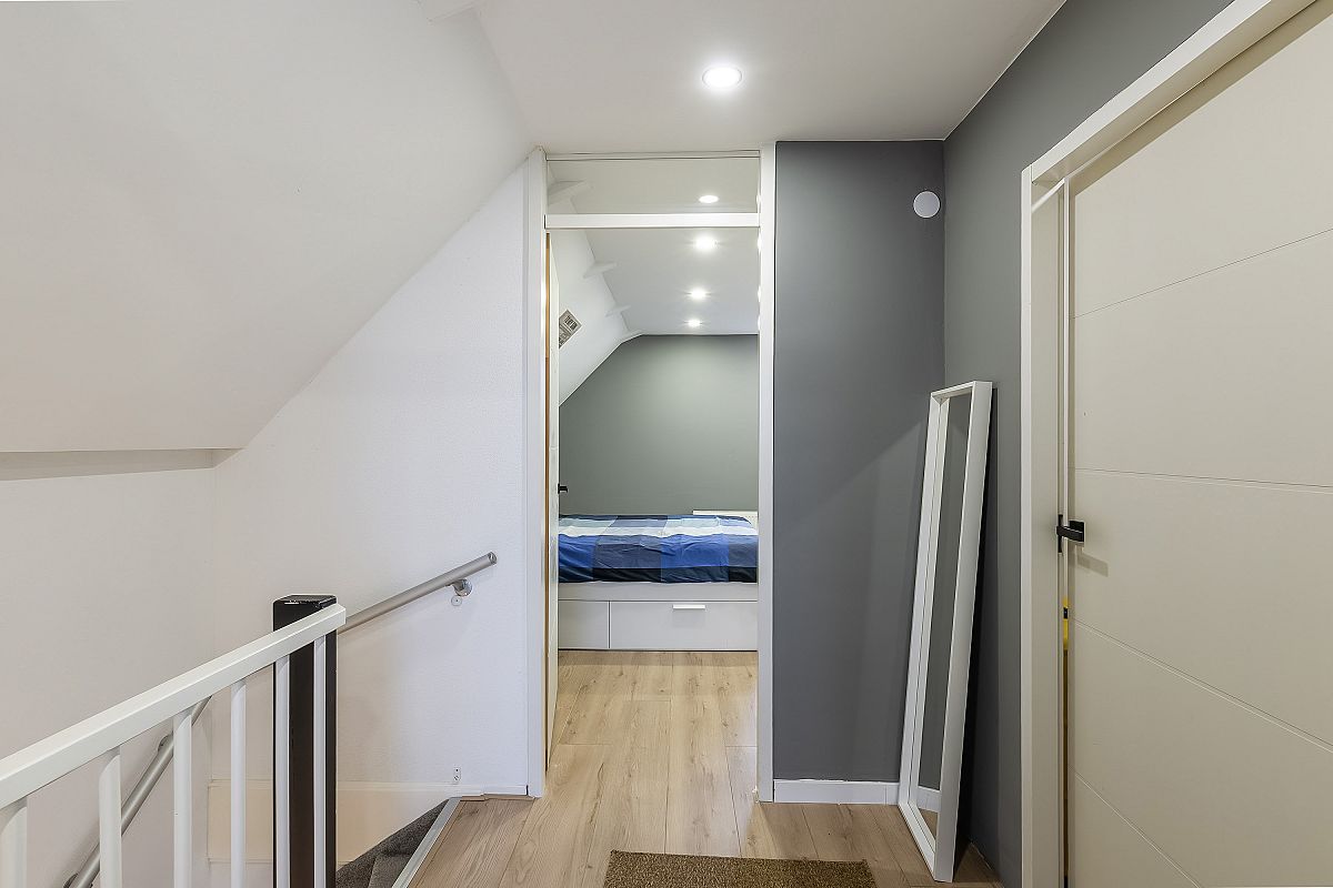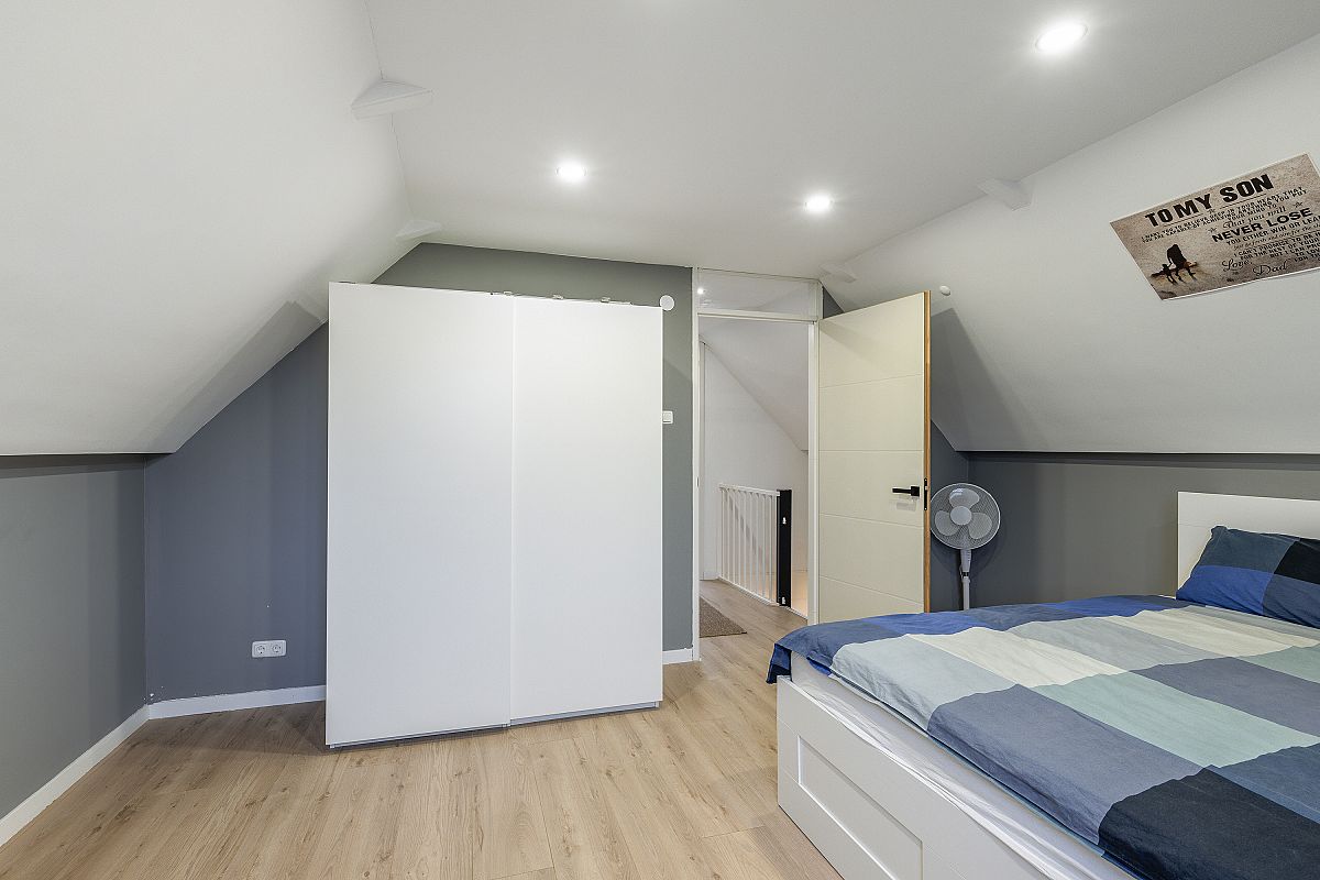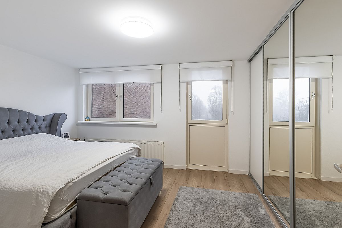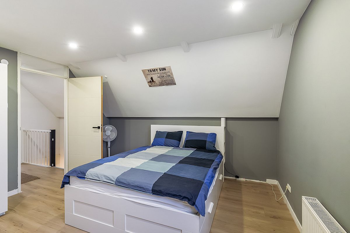 Overloop, trapopgang naar de 2e verdieping, berg kast, kast met aansluiting wasmachine/droger. Ruime slaapkamer van meer dan 15m2. In het midden van de verdieping ligt de ruim bemeten badkamer. De badkamer is modern uitgevoerd en voorzien van een inloopdouche, mechanische ventilatie, 2e toilet, wastafel met spiegelkast met verlichting. De 2e slaapkamer is vergelijkbaar met de andere en is ook ruim met ca. 15m2.