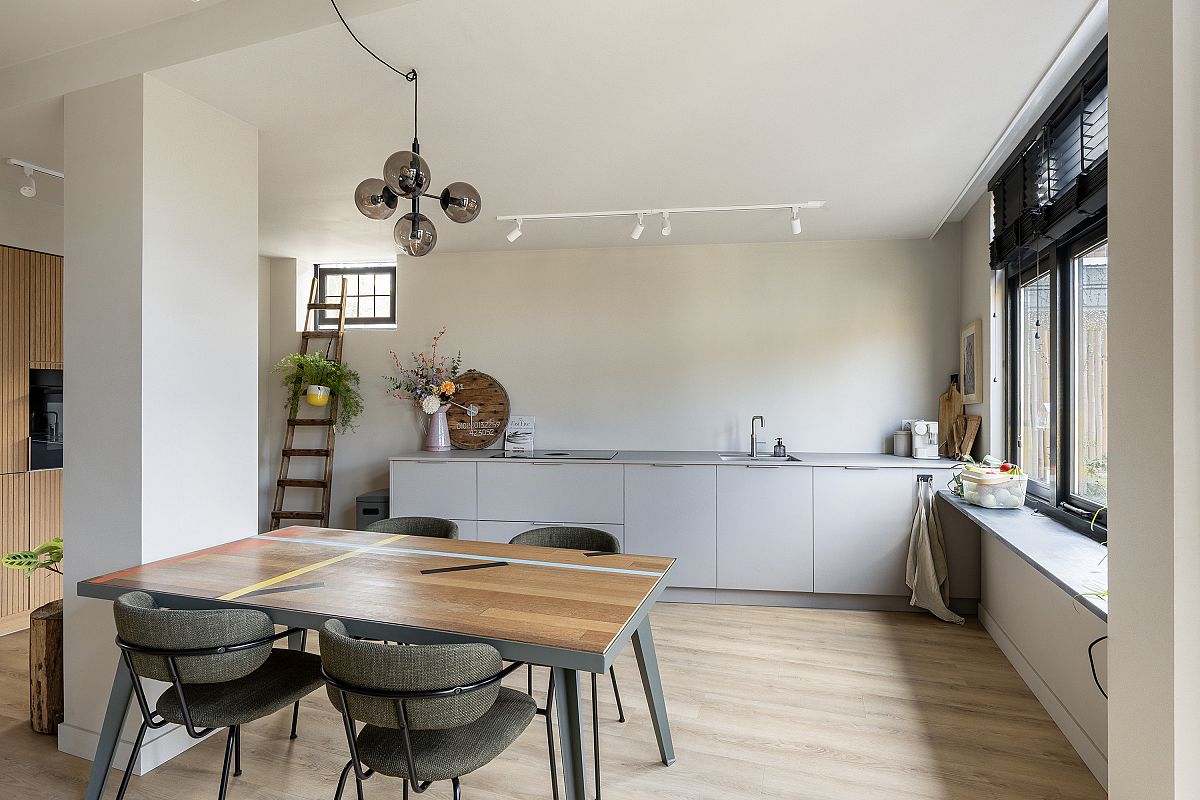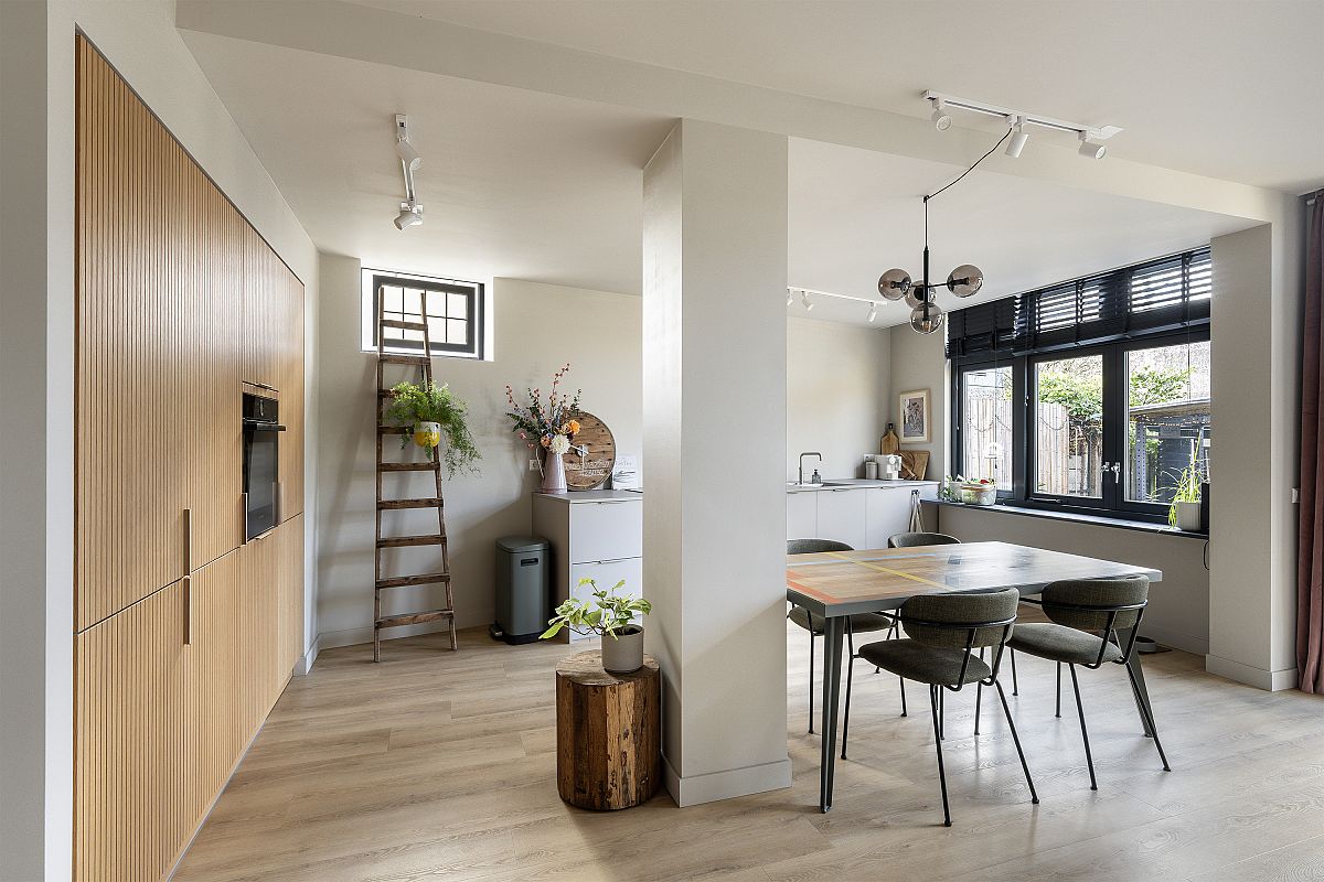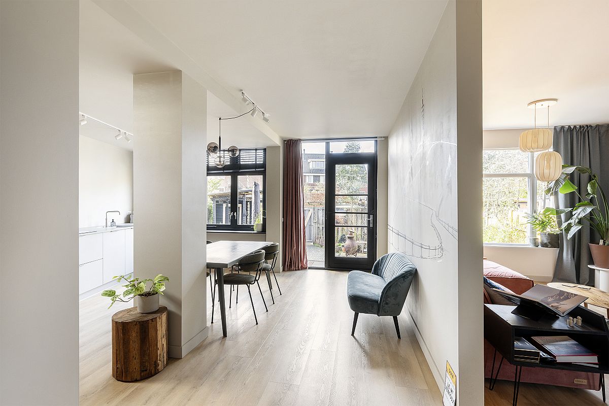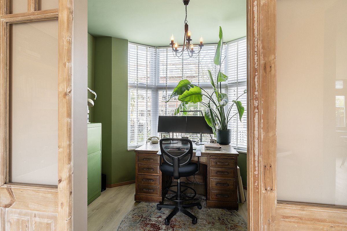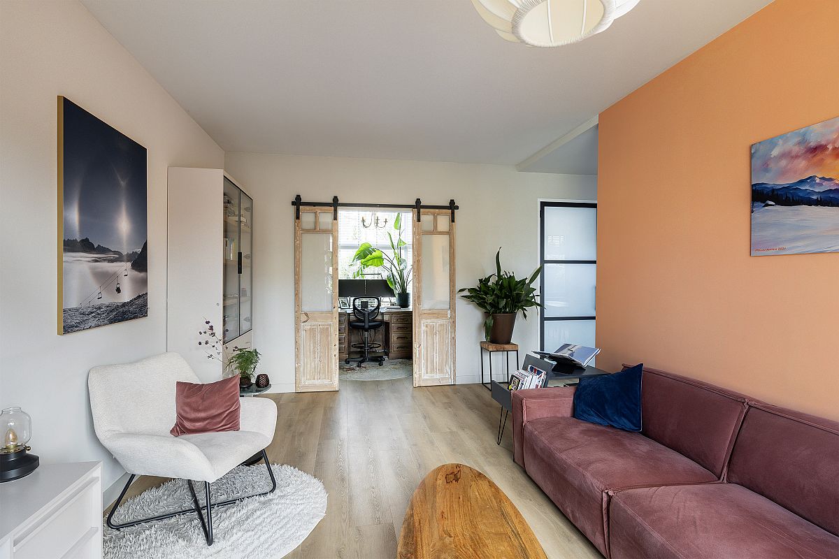 Adjacent to the kitchen is the sitting area, perfect for relaxing with a book or film while still maintaining connection with the kitchen. At the front of the house there is a charming study of approximately 7.7 m², featuring an original bay window.