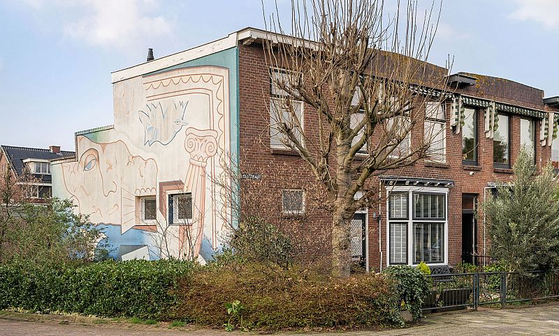 -Kunstwerk "Eeuwig venster van verleden en toekomst" aan de zijgevel.