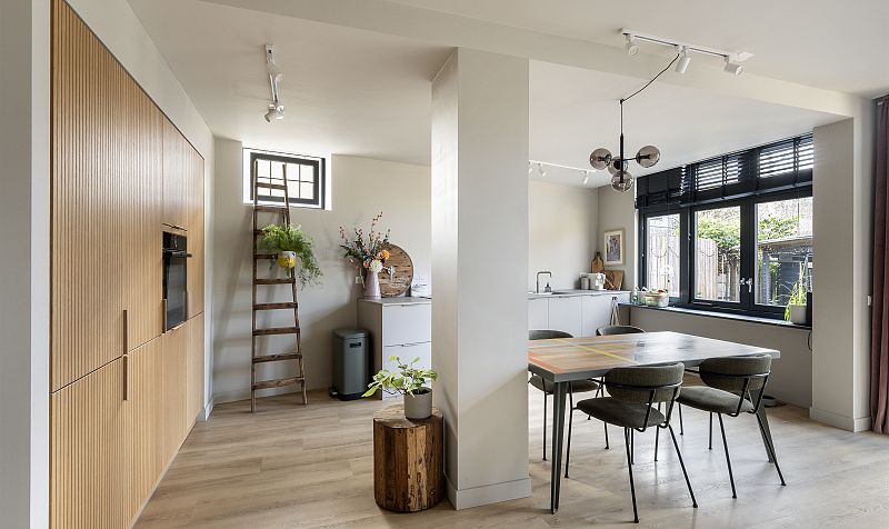 Behind the kitchen, a practical utility/storage room has been created, ideal for provisions, with the meter cupboard also located here. The luxurious kitchen is equipped with various built-in appliances, including a fridge/freezer drawers, oven, dishwasher, Bora induction hob, Quooker tap and ample cupboard space. The kitchen also offers a pleasant view of the garden.