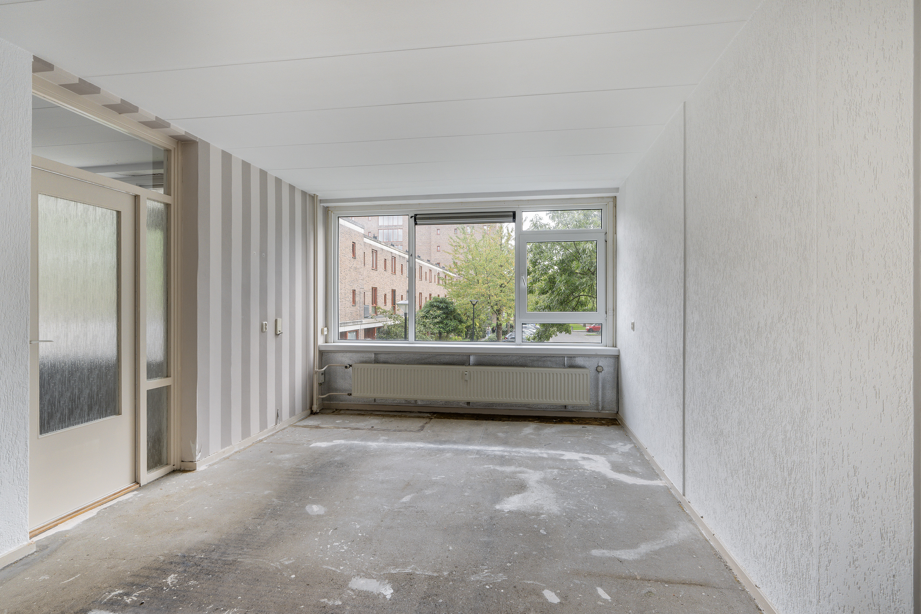 Entree appartement, hal, meterkast, aparte keuken met eenvoudig keukenblok, vaste kast en boiler. Separaat toilet. Badkamer met douche wastafel en wasmachineaansluiting. 3 slaapkamers van respectievelijk 8.3m2, 6.4m2 en 13.5m2. De grootste slaapkamer geeft toegang tot het balkon. De woonkamer is bijna 21m2.