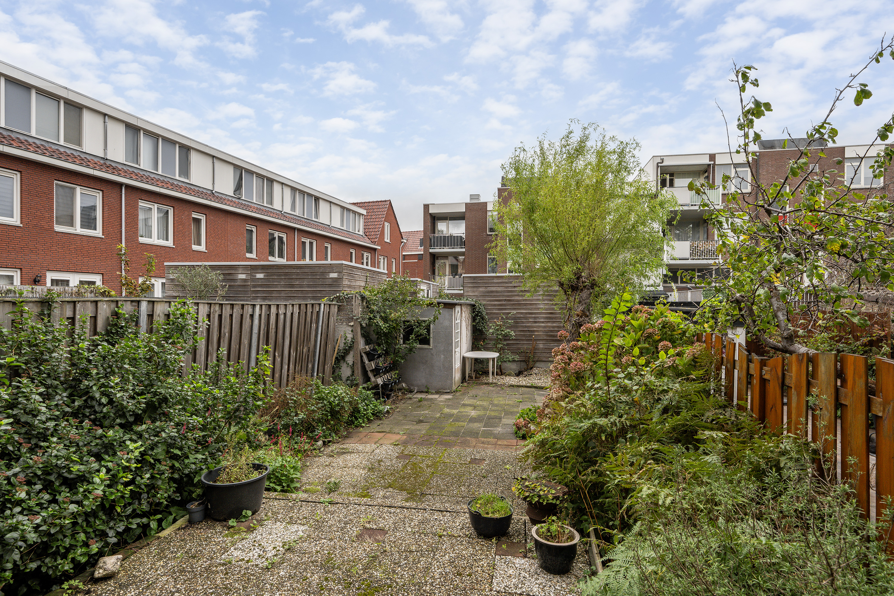 Zonnige achtertuin op het westen van ca. 14m diep en ca. 5,4m breed voorzien van een berging van 3,5m x 1,6m. Geen achterom.